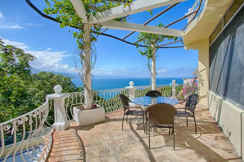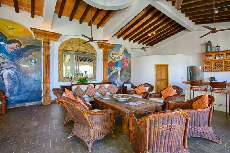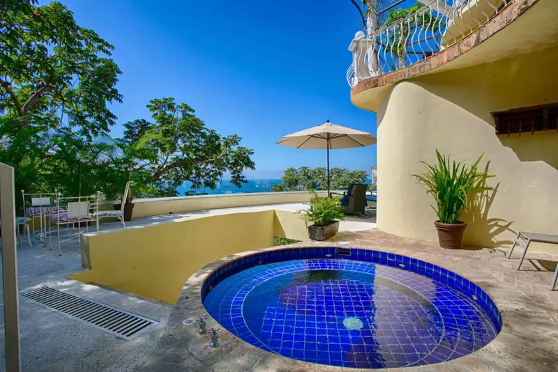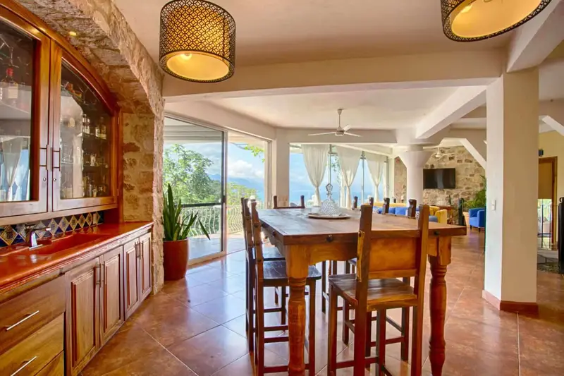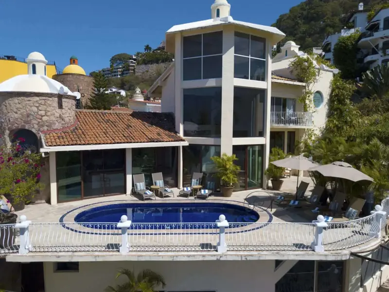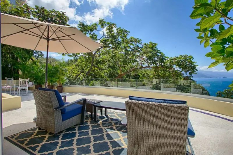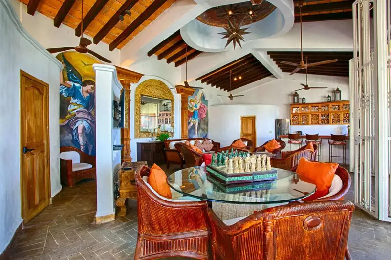 The villa is a unique and comfortable Mexican Villa with distinct cupolas, a majestic atrium, traditional Spanish tile and porticos, modern amenities, and an expansive layout. Lush jungle greenery surrounds the property, flowing dramatically into blue waters with a clear view of “Los Arcos” the famous Puerto Vallarta landmark in the distance.