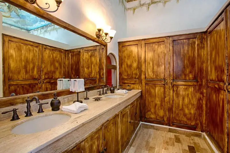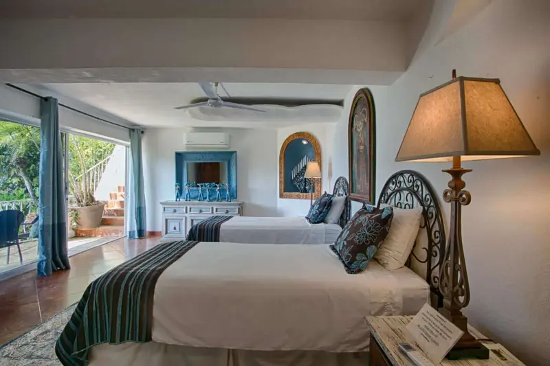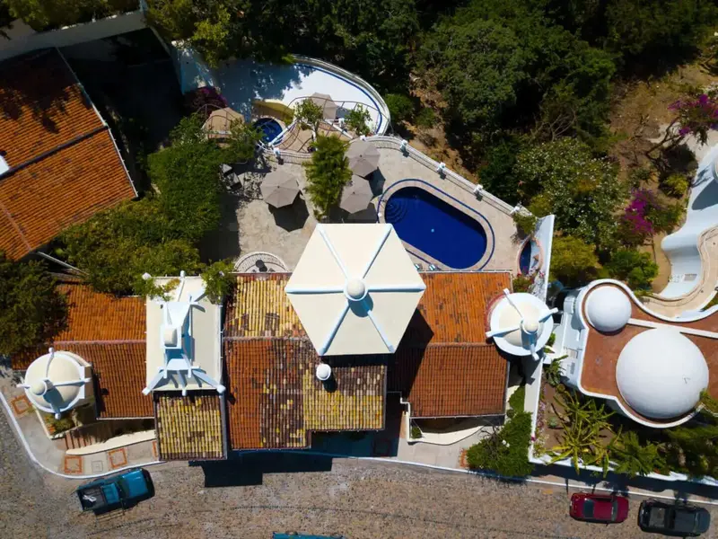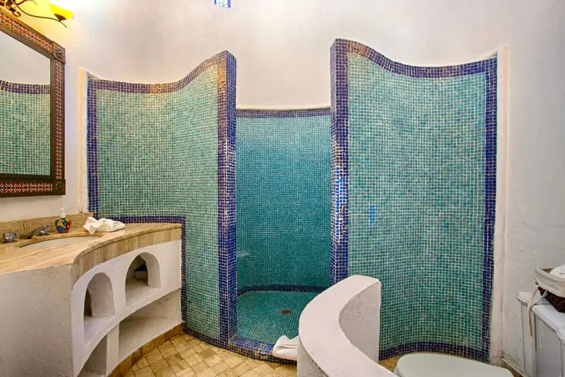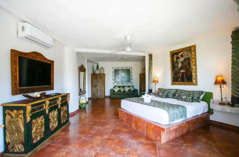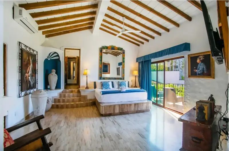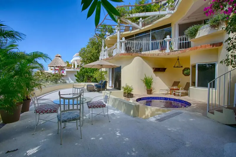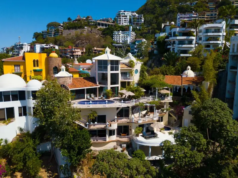 The villa is a unique and comfortable Mexican Villa with distinct cupolas, a majestic atrium, traditional Spanish tile and porticos, modern amenities, and an expansive layout. Lush jungle greenery surrounds the property, flowing dramatically into blue waters with a clear view of “Los Arcos” the famous Puerto Vallarta landmark in the distance.