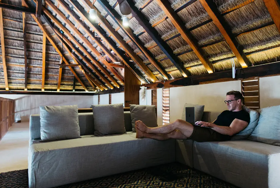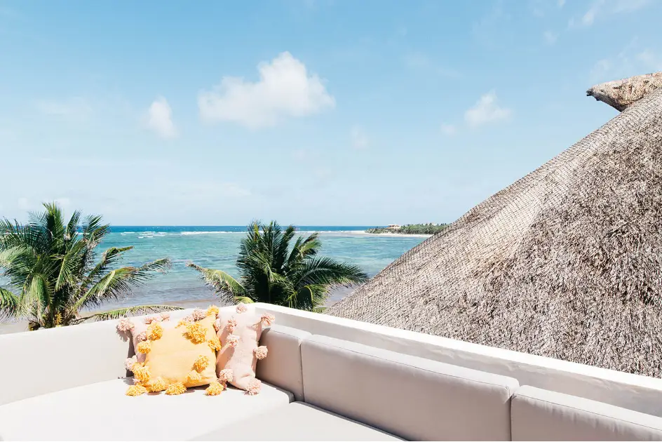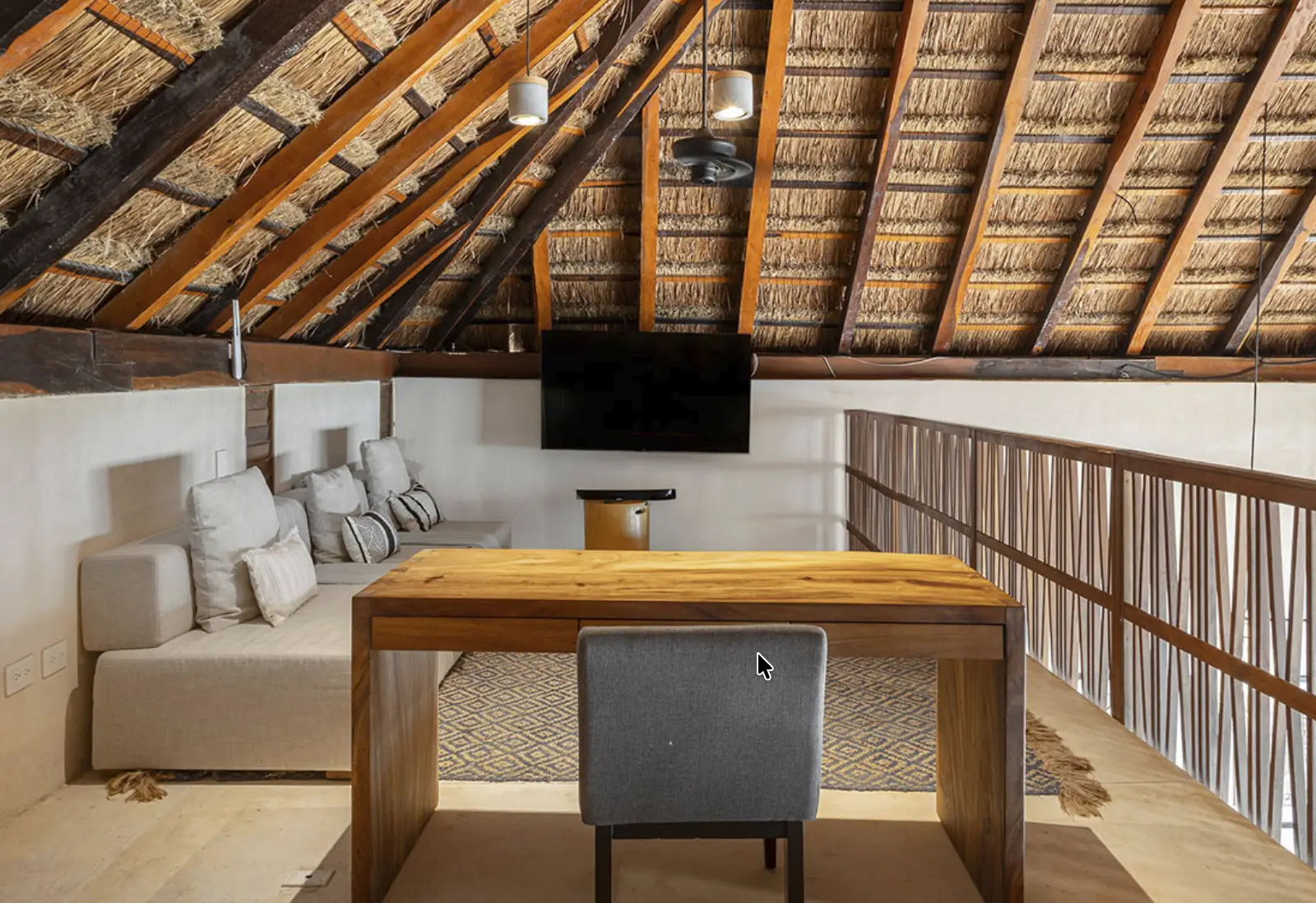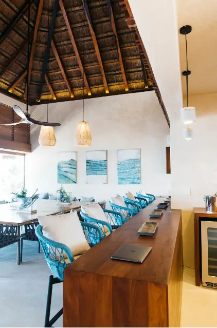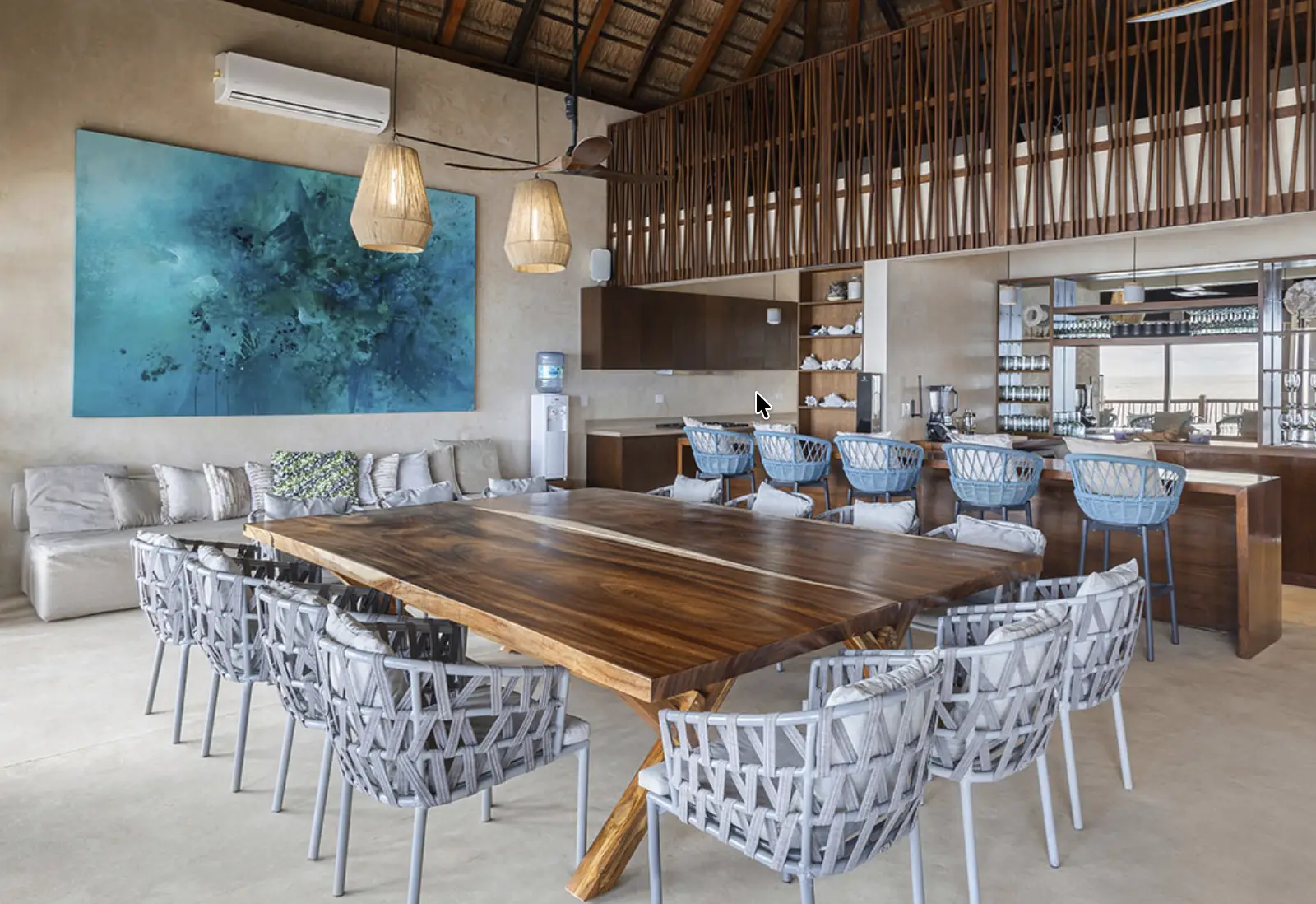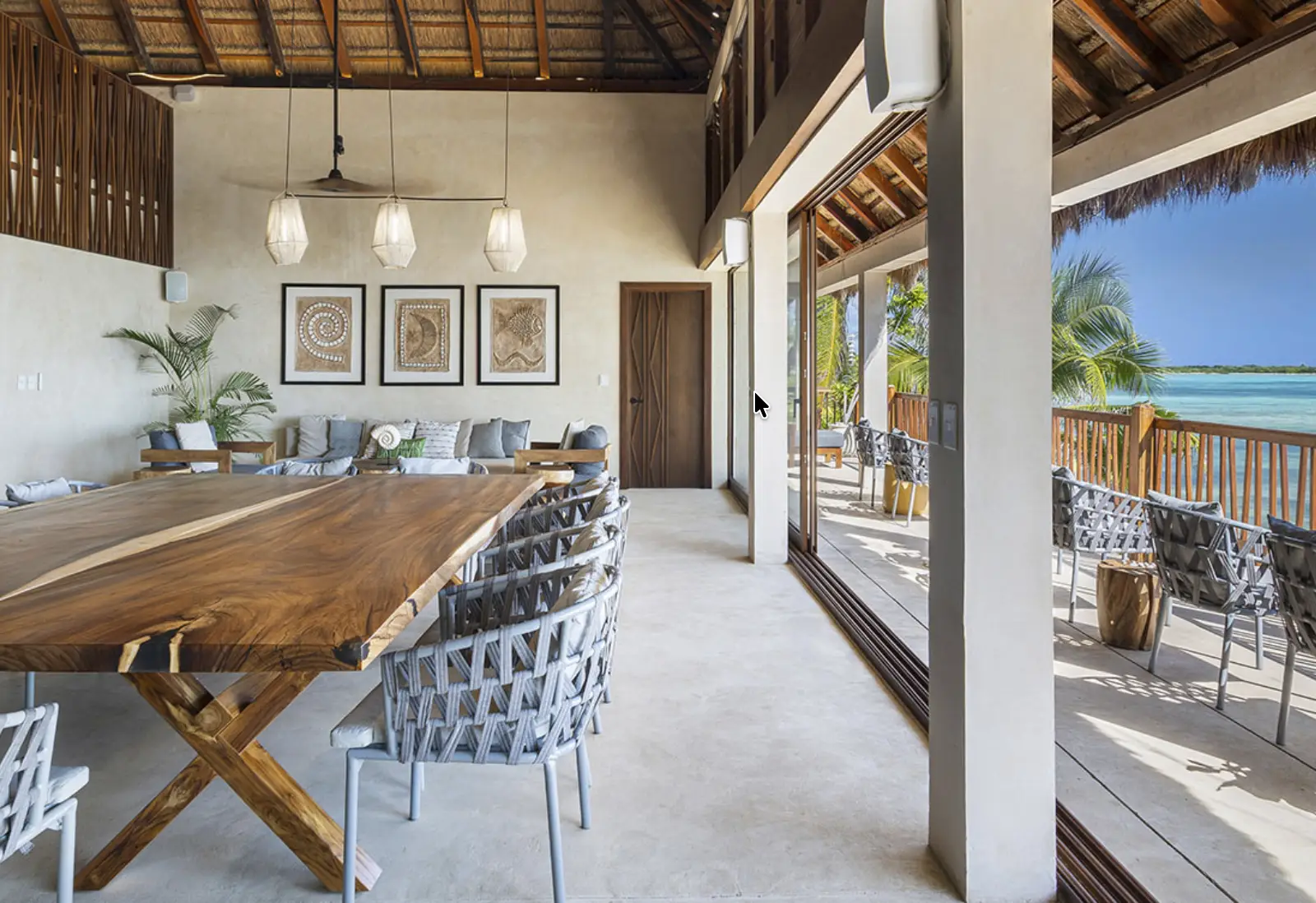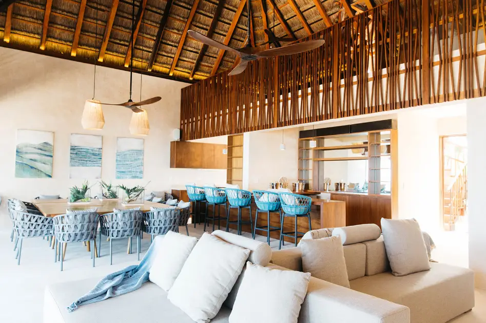 Expansive open-air living & dining areas with palapa roofs and minimalist décor