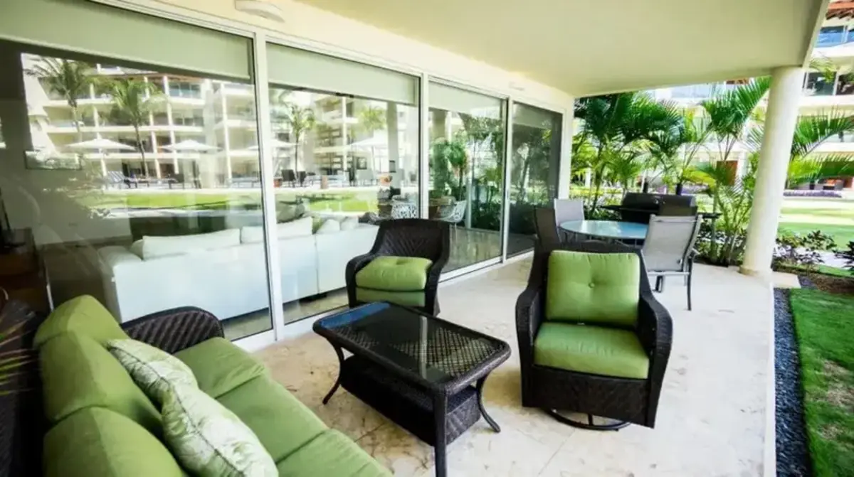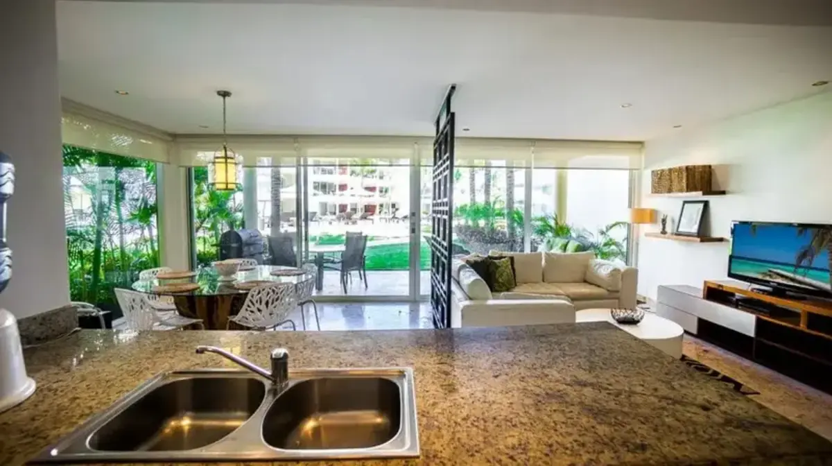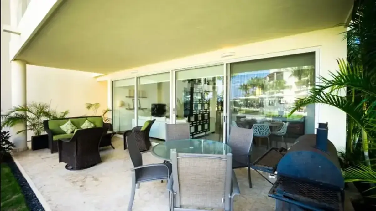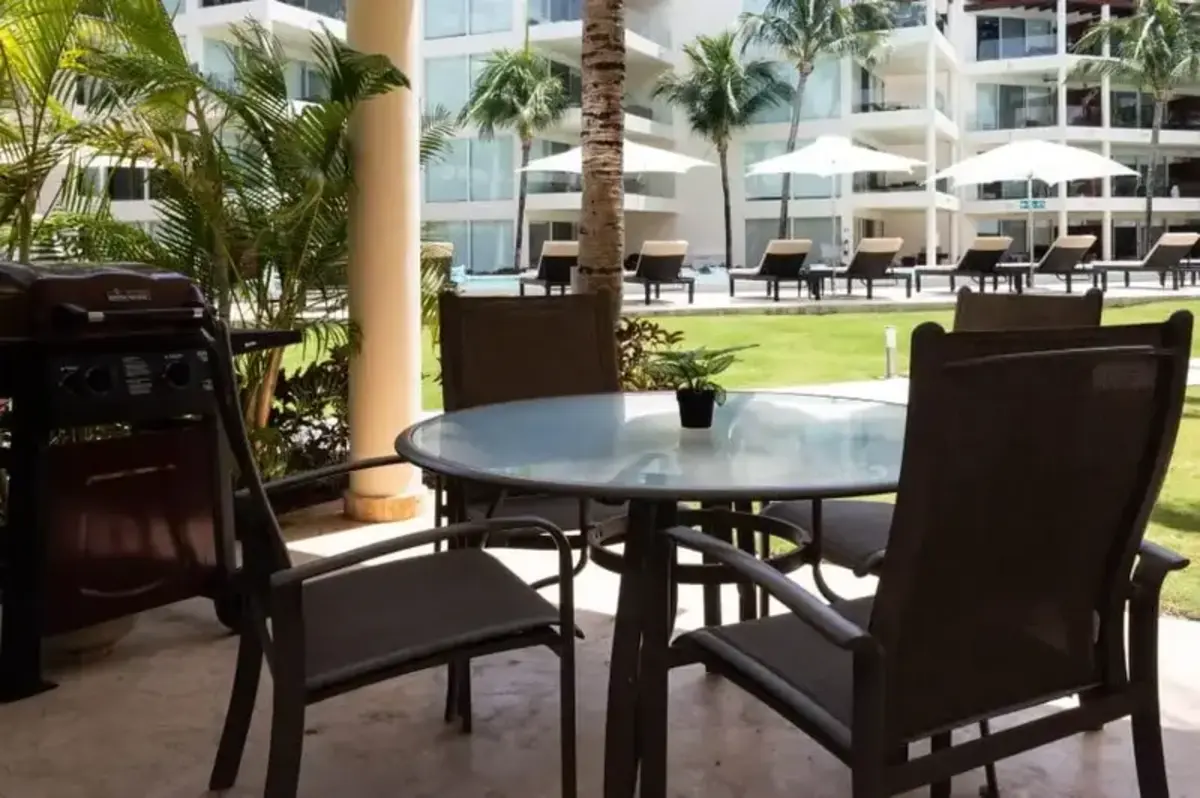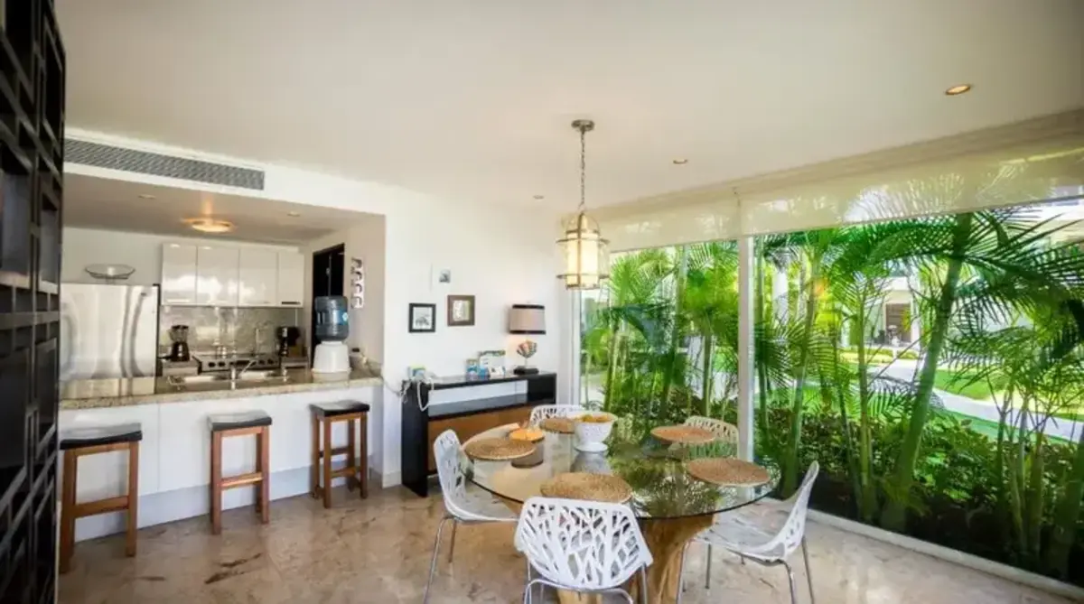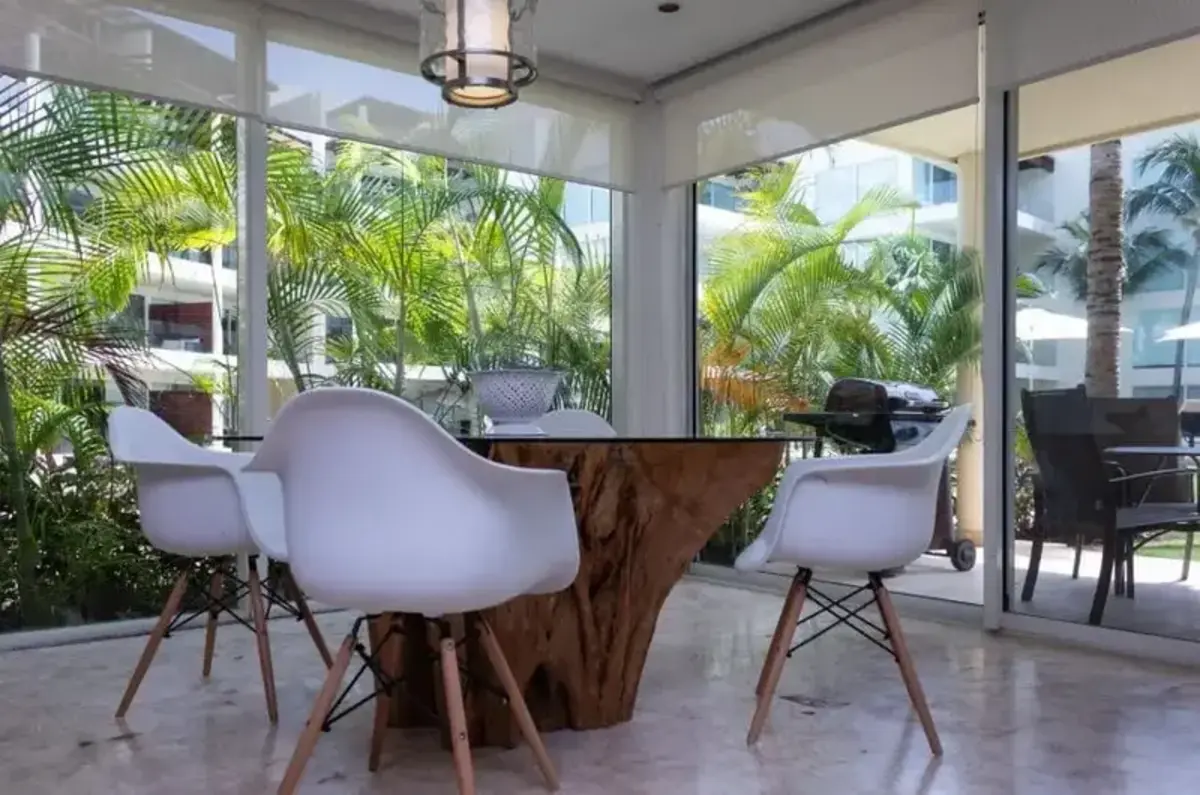 Inside, floor-to-ceiling windows bathe the open-concept living space in radiant Mexican sunlight and lush garden views. The airy layout flows effortlessly to a private terrace complete with outdoor dining set, comfortable lounge seating, and a gas grill — ideal for morning coffee, afternoon relaxation, or evening BBQs with the Caribbean breeze as your backdrop.