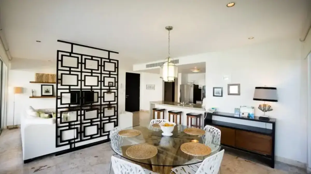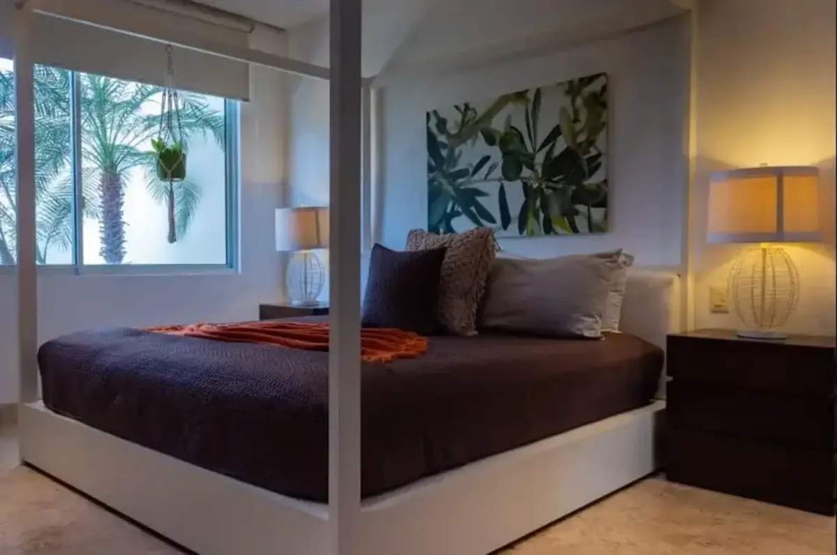 The condo comfortably accommodates up to 6 guests with two well-appointed bedrooms: a luxurious master with a king-sized four-poster bed and a second bedroom with two double beds. Two spa-style marble bathrooms feature rainfall showers, premium organic toiletries, and hairdryers for a true resort-like feel.