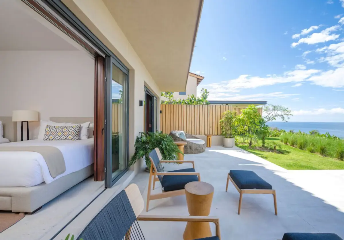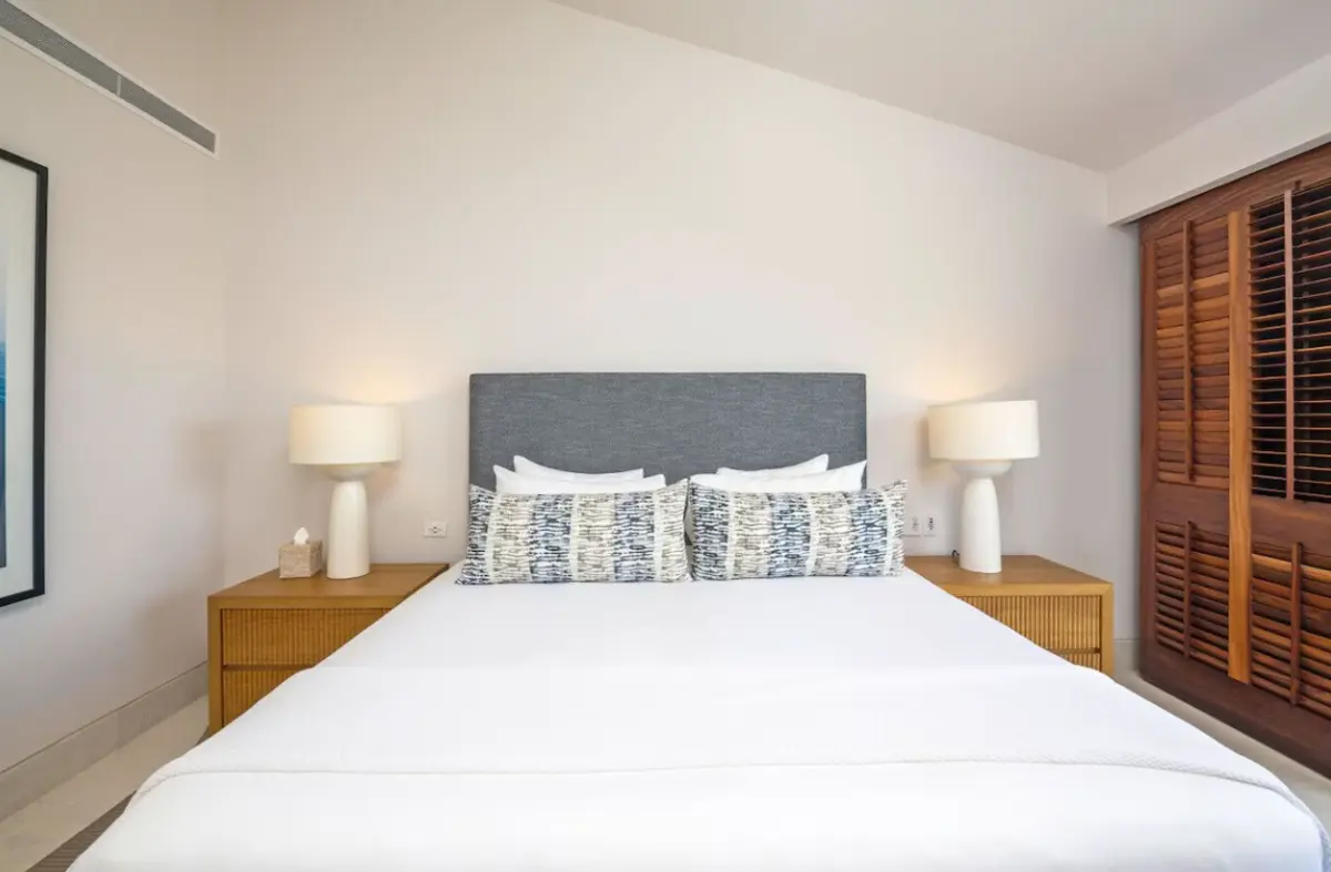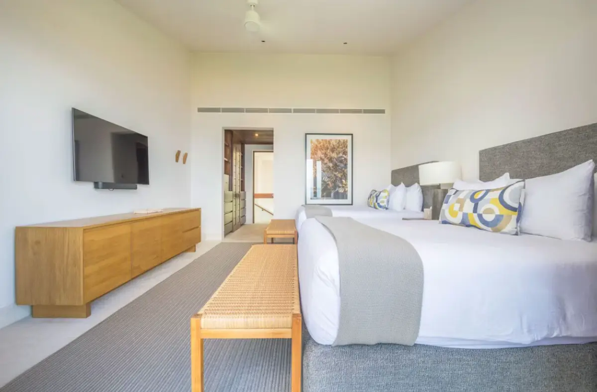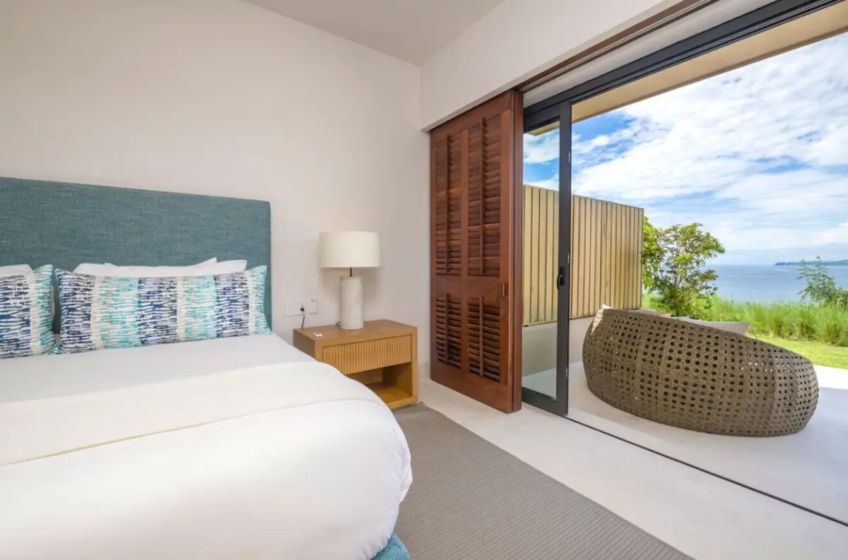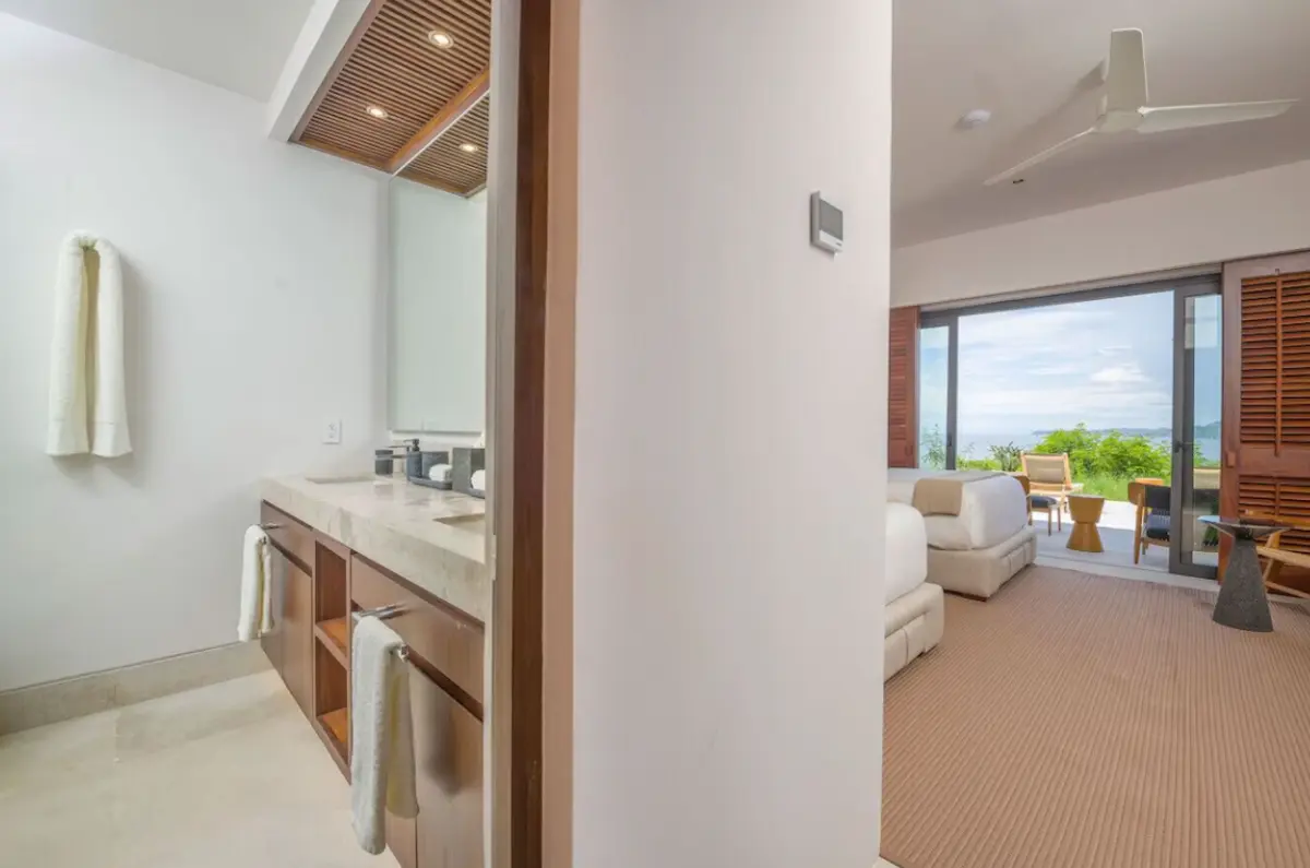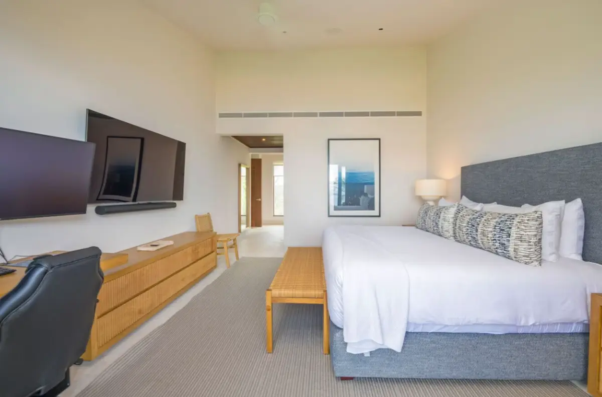 - Primary Bedroom – King-size bed, en-suite spa bathroom with tub & double sinks, dedicated workspace, direct access to oceanview patio