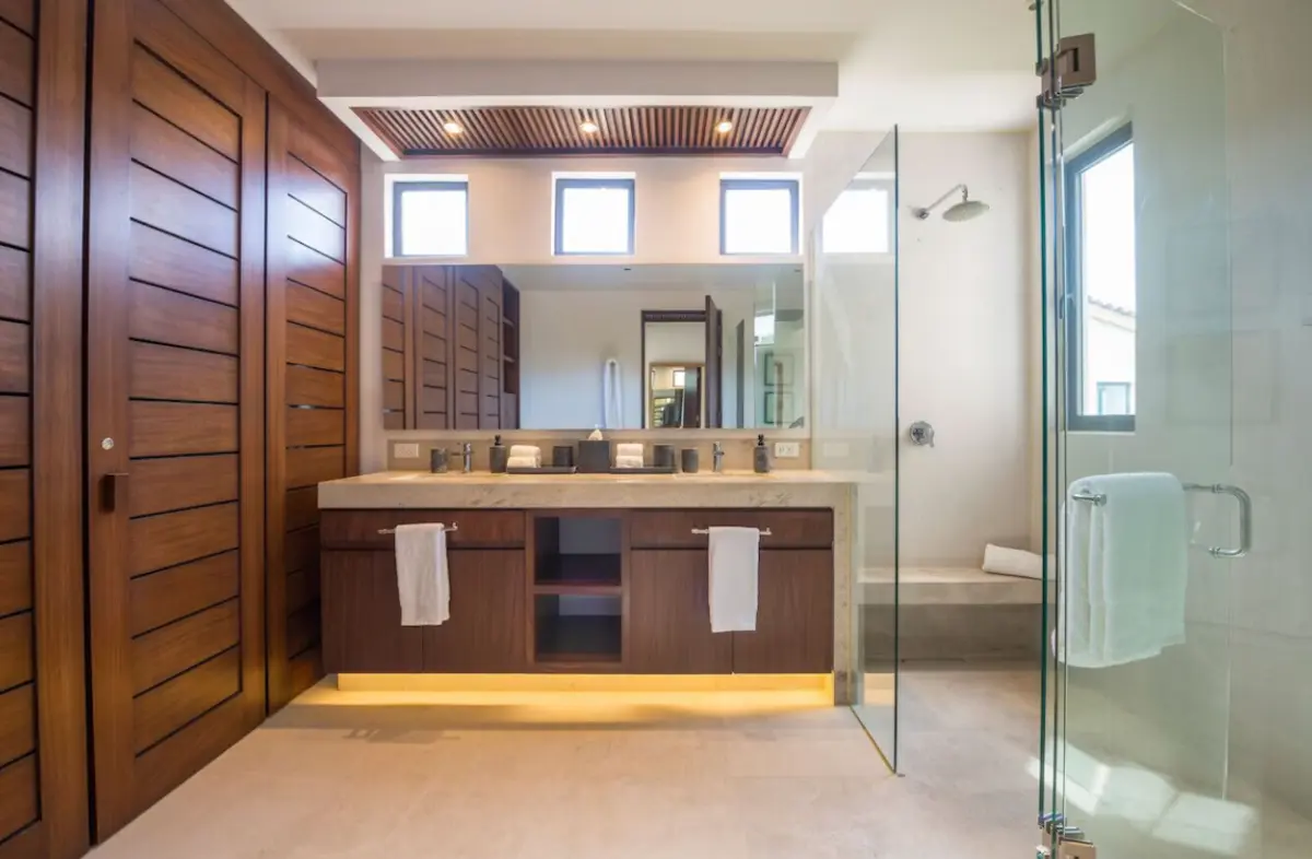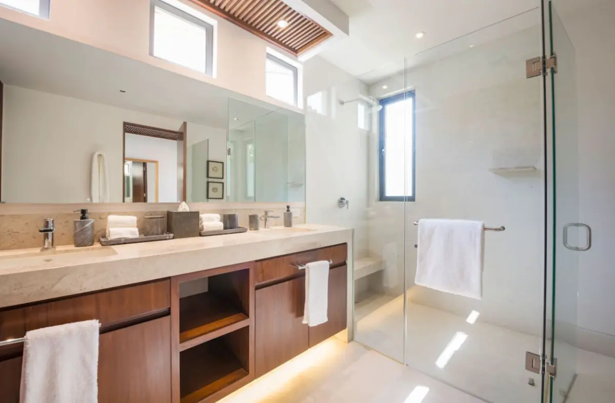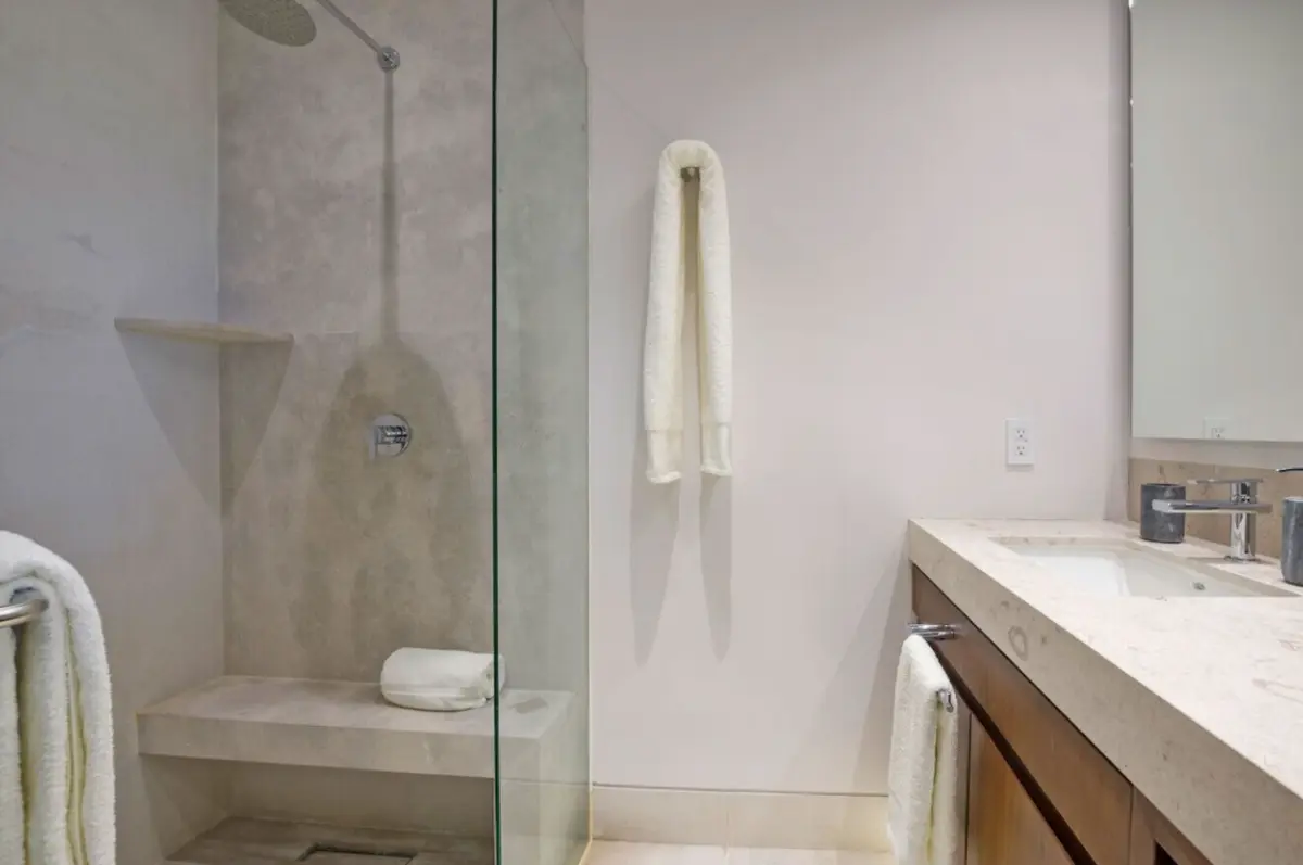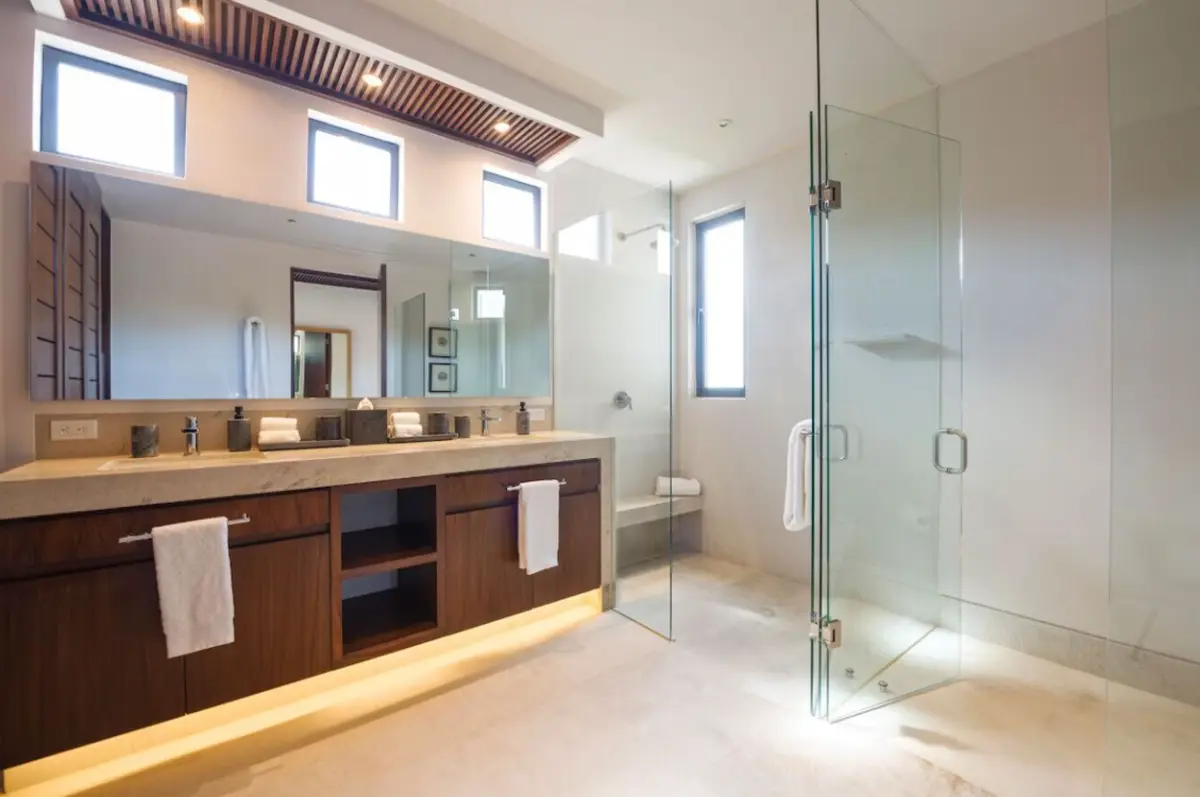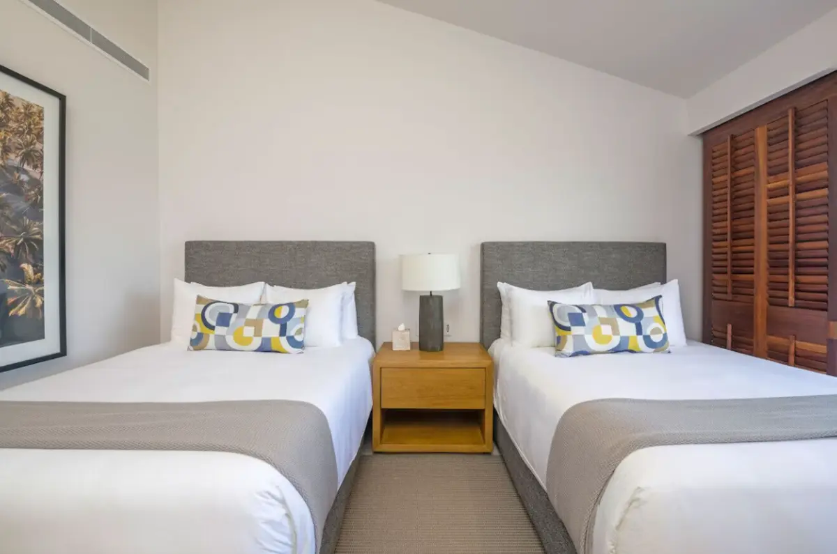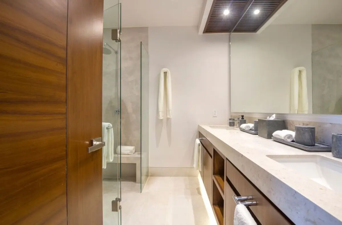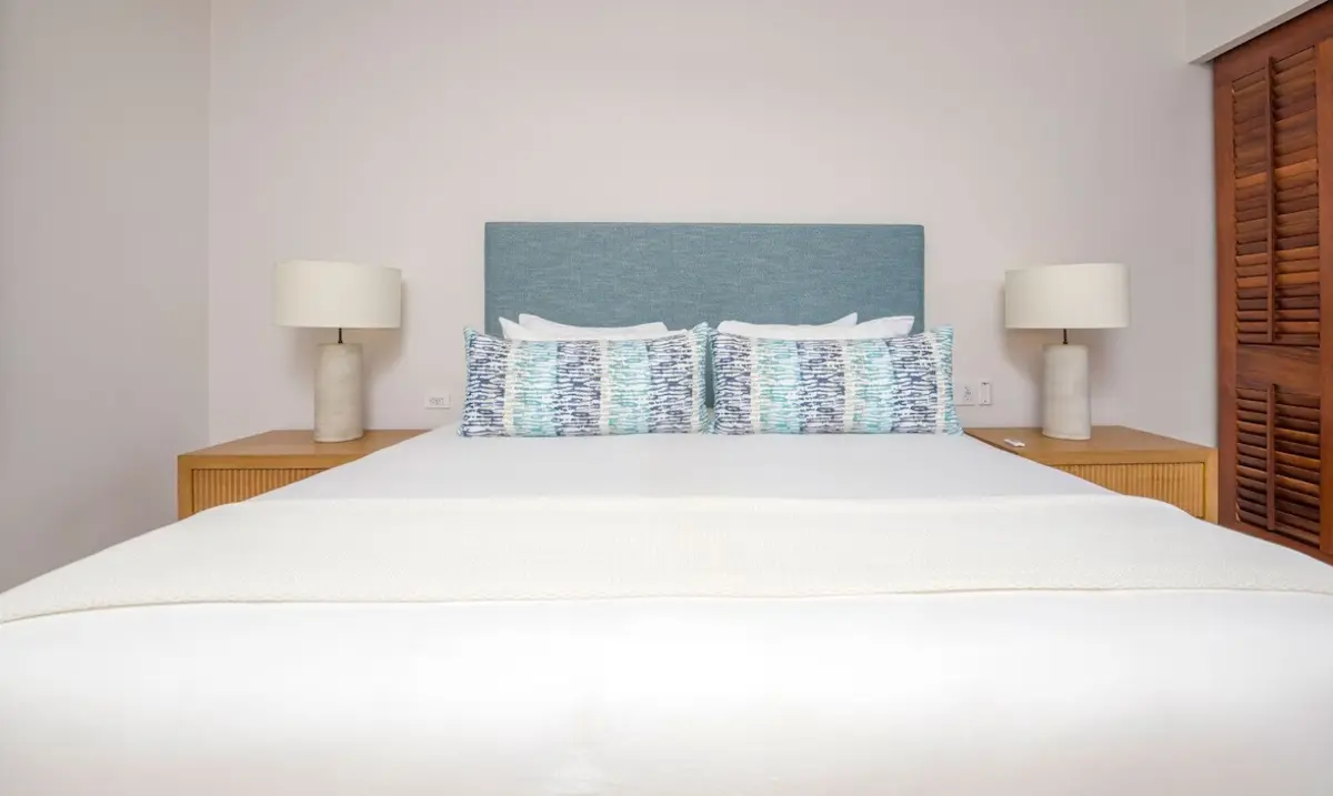 - Primary Bedroom – King-size bed, en-suite spa bathroom with tub & double sinks, dedicated workspace, direct access to oceanview patio