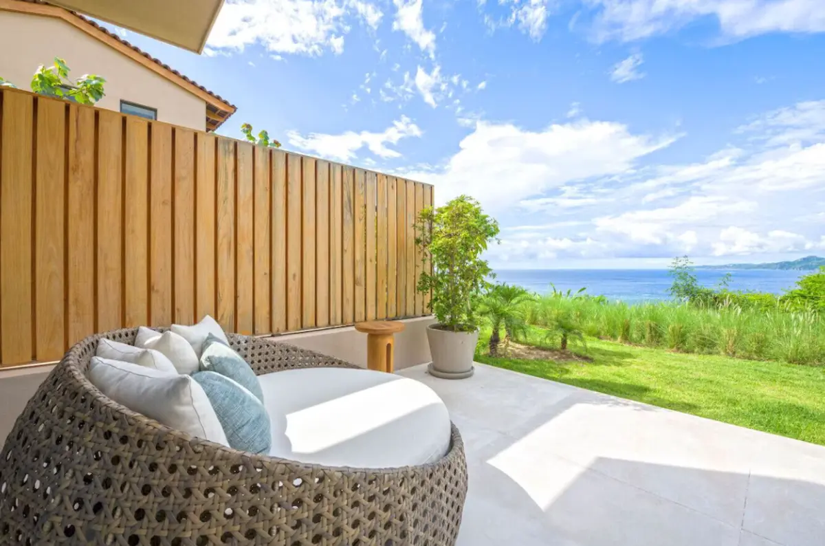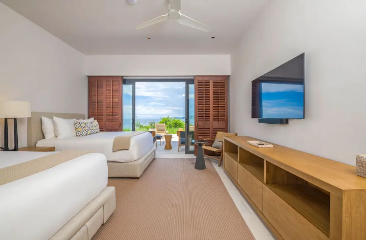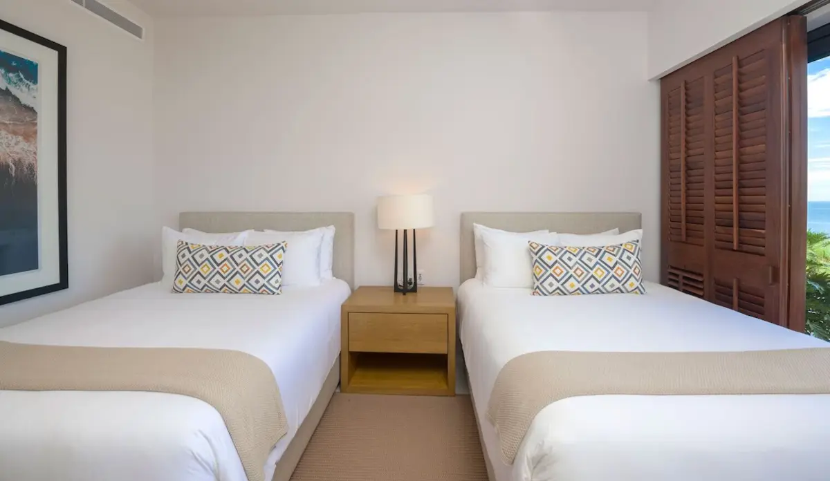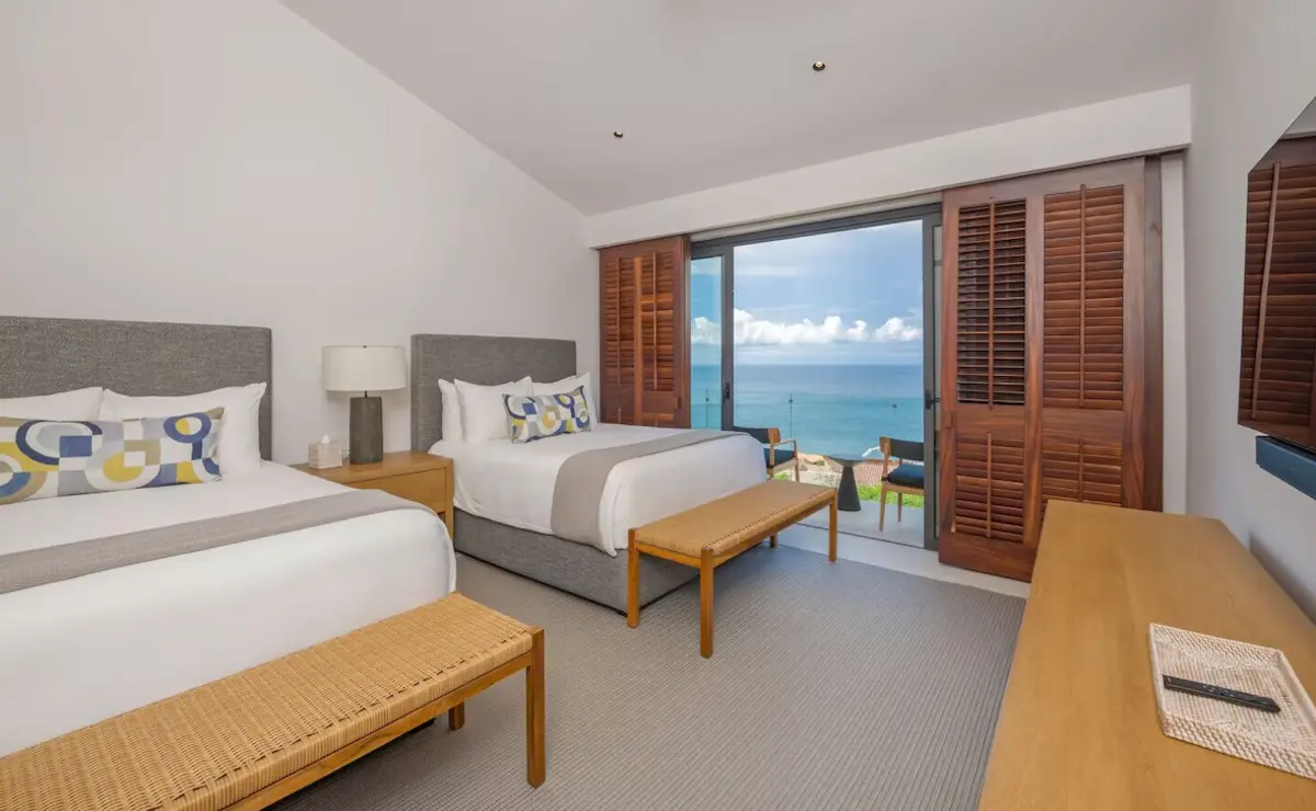 - Bedroom 2 – Two double beds, en-suite bathroom, private patio with ocean views