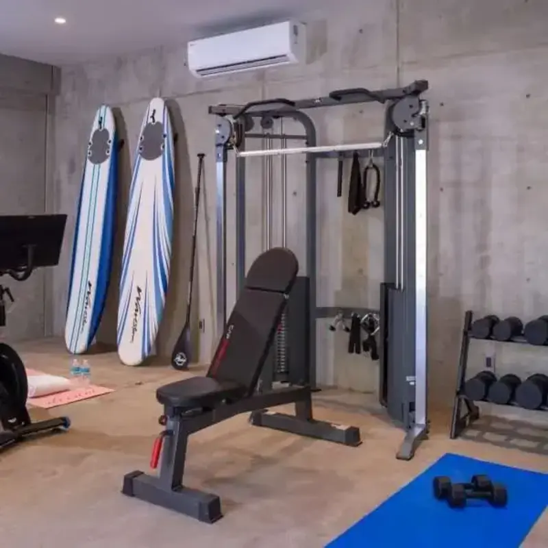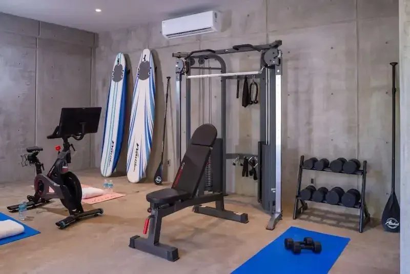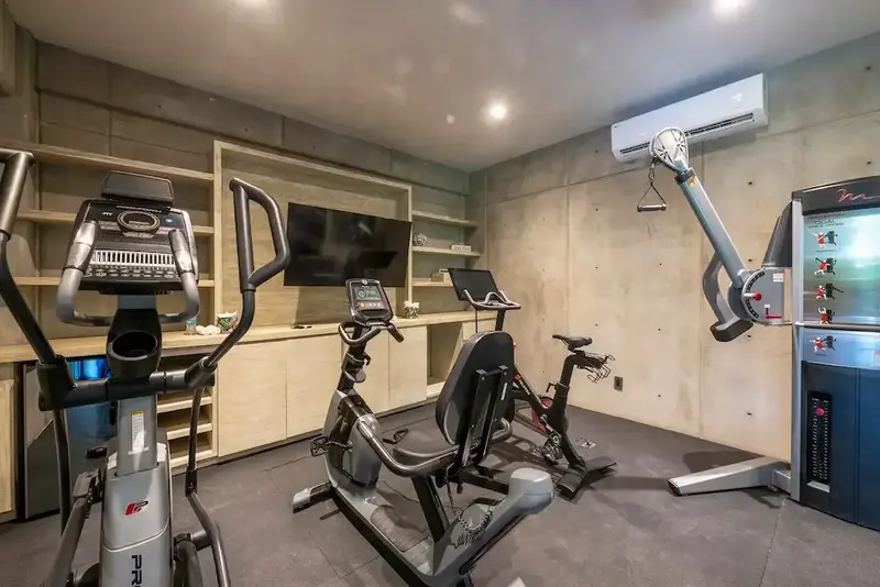 Private fitness center with Peloton, elliptical, and free weights