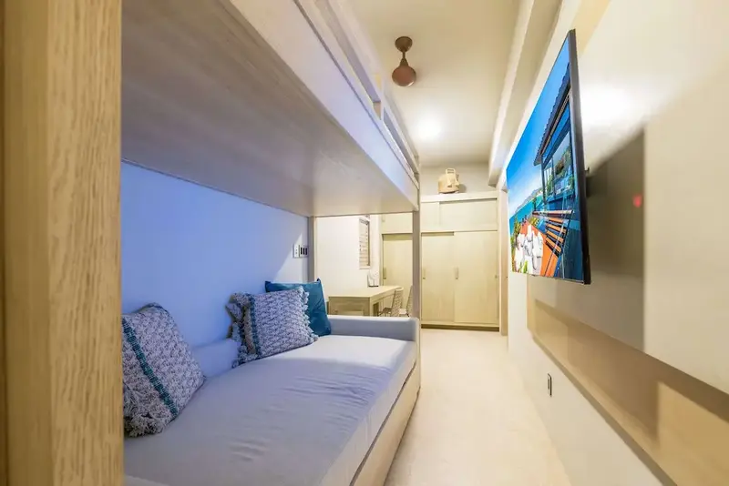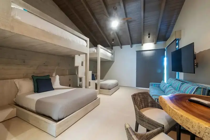 Bunk room with multiple beds + indoor/outdoor showers