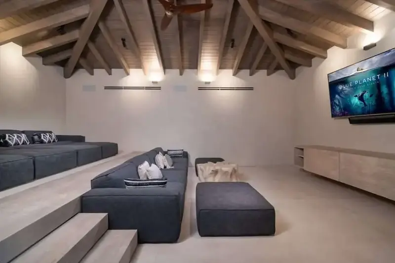 Expansive 500 sq. ft. media room with 82” Smart TV, PlayStation, and seating for 15