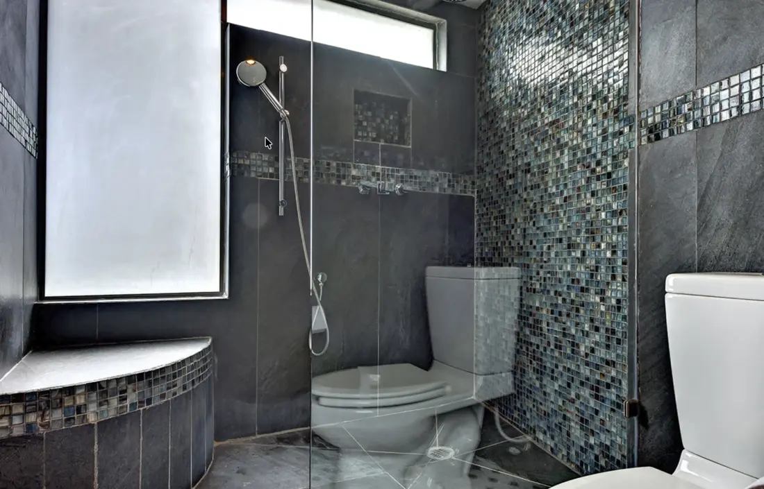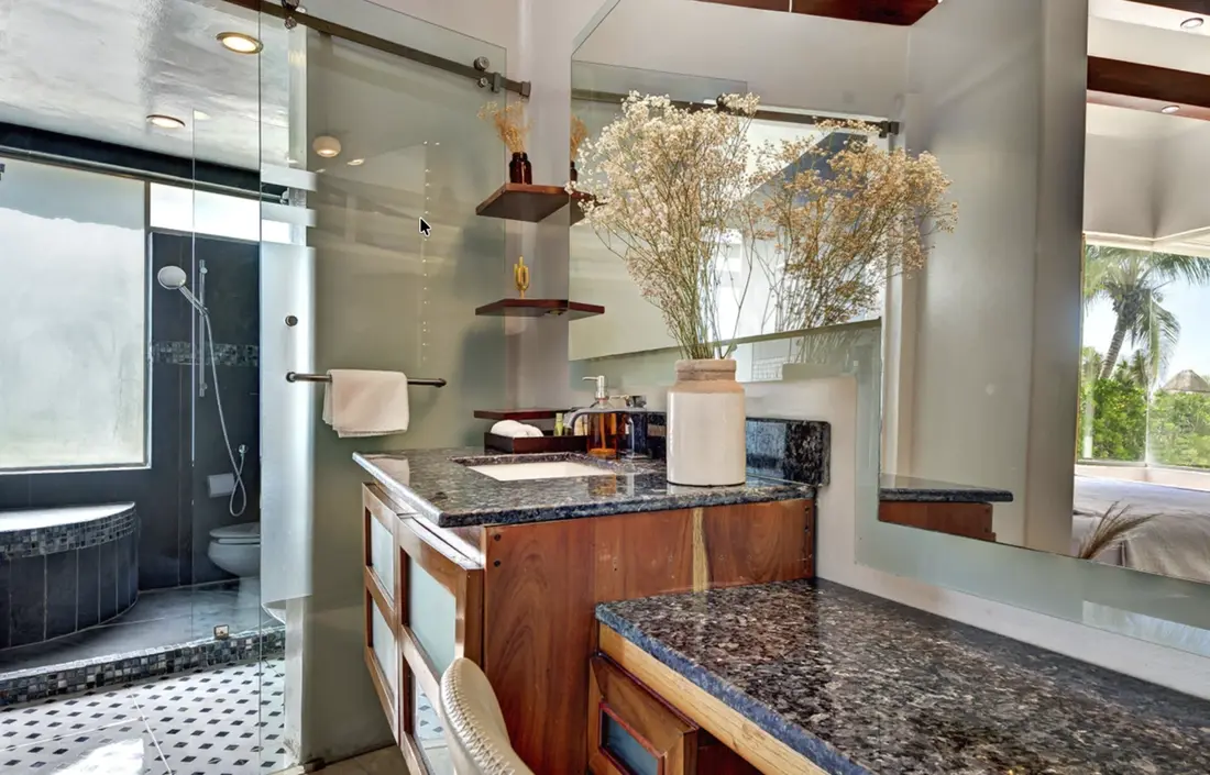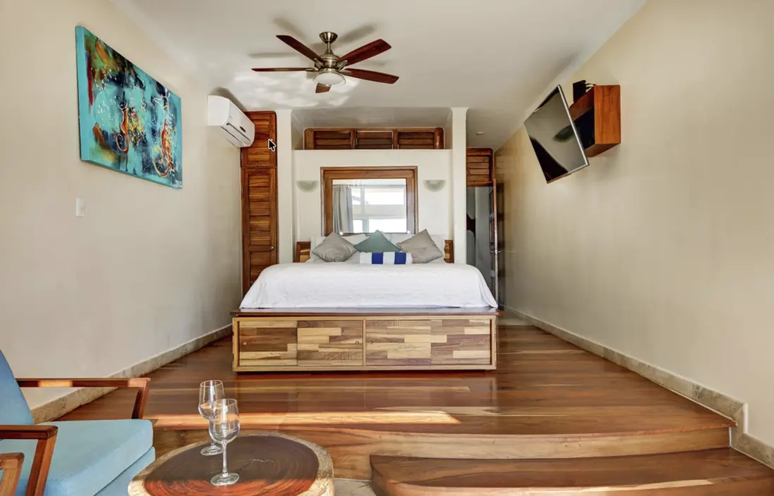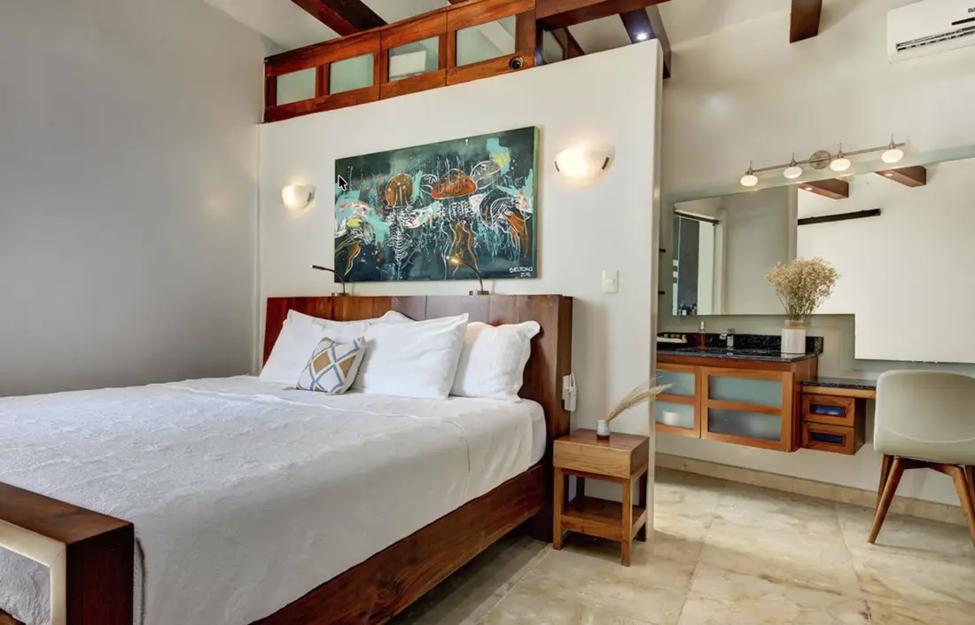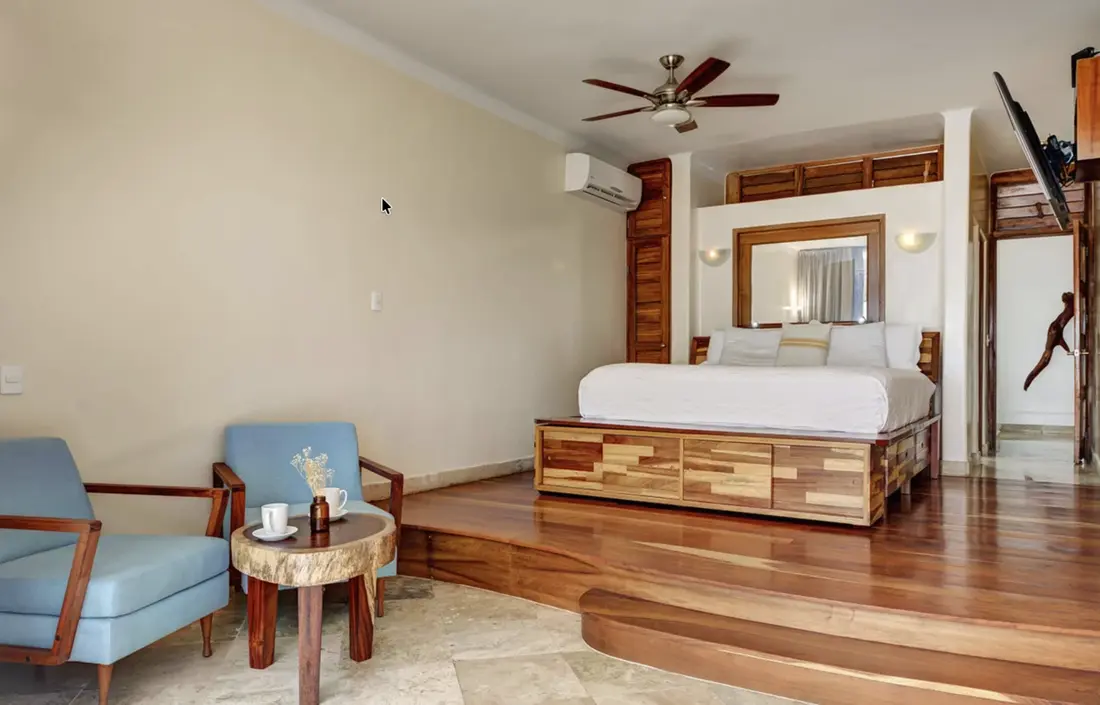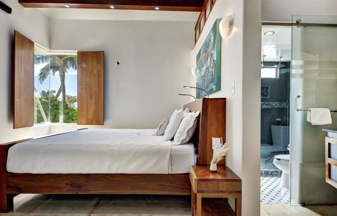 - Master Bedroom (Upper Floor) – King-size bed, ensuite bathroom with shower & Jacuzzi bathtub, walk-in mahogany closet, lounge area, flat-screen TV, private palapa-covered terrace with infinity pool, ocean views