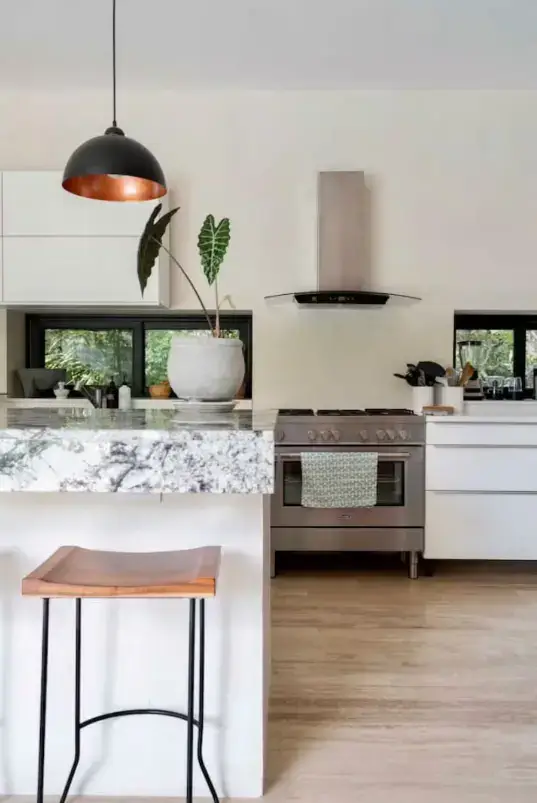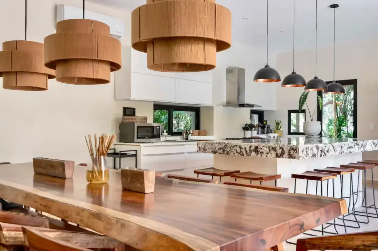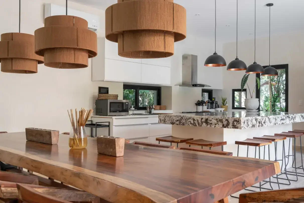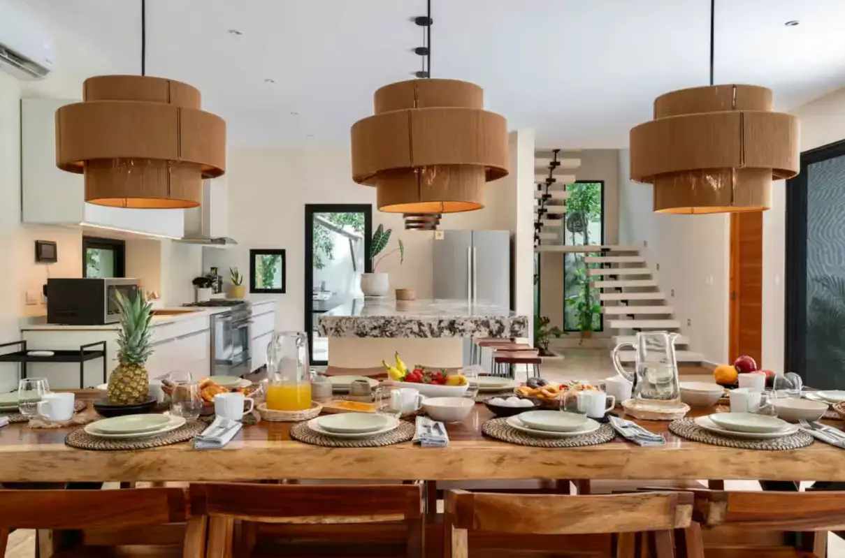 Living Spaces: Open-concept layout with a chef-ready kitchen, expansive dining table, and cozy lounge.