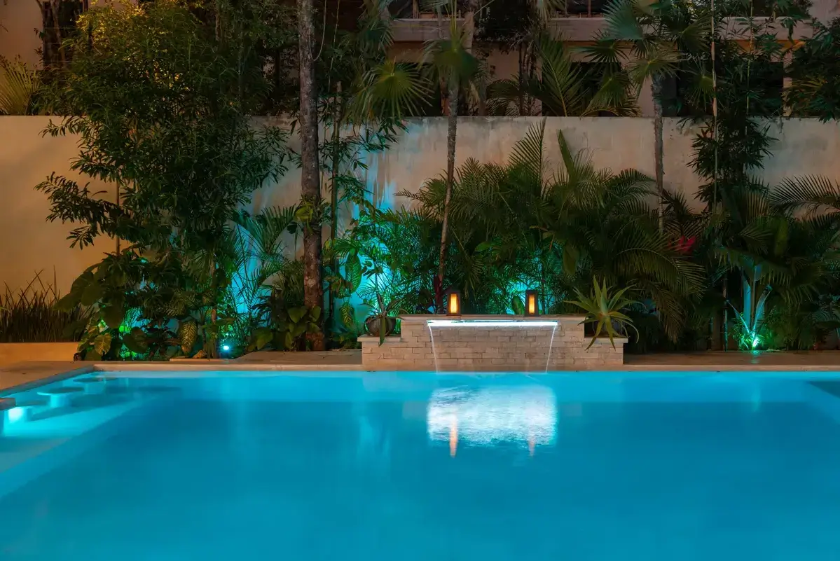 Outdoor Oasis: 80m² private pool with waterfall, swim-up bar, yoga platform, sun loungers, BBQ area, and shaded lounge nooks. As evening falls, ambient lighting transforms the gardens into a magical retreat.