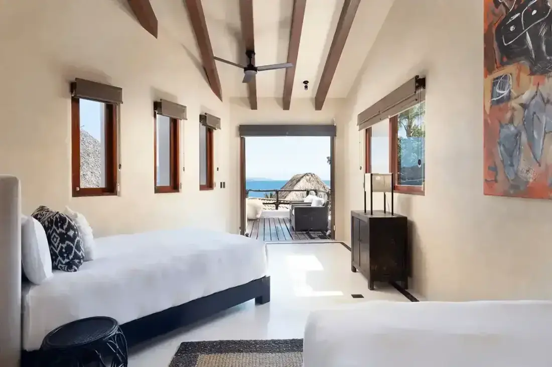 - Master Suite (Patrona Guest) – King bed, ocean terrace, tub + shower, A/C, fan, coffee maker, minibar, organic toiletries, robes, satellite TV, Wi-Fi