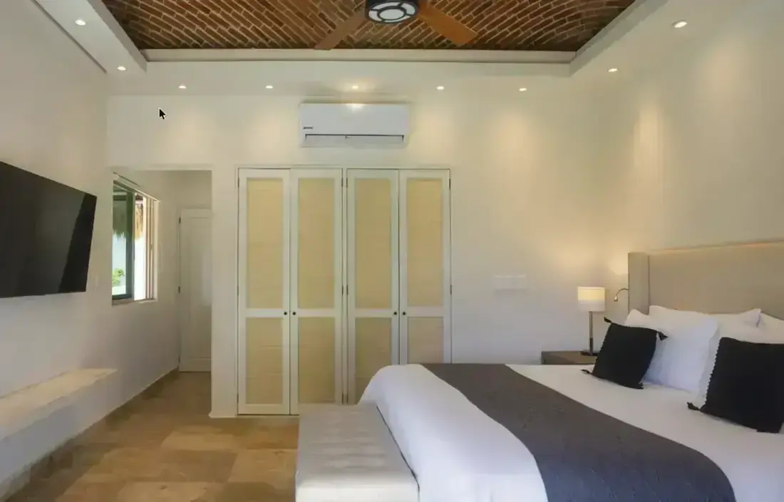 - Master Bedroom – King-size bed, ensuite bathroom with shower, pool view, safety box, TV, private terrace, outdoor lounge furniture, private entrance