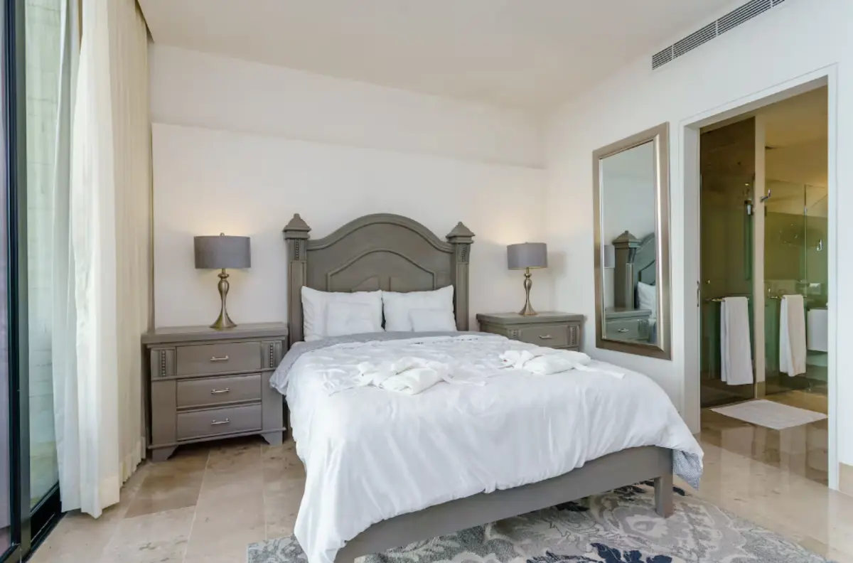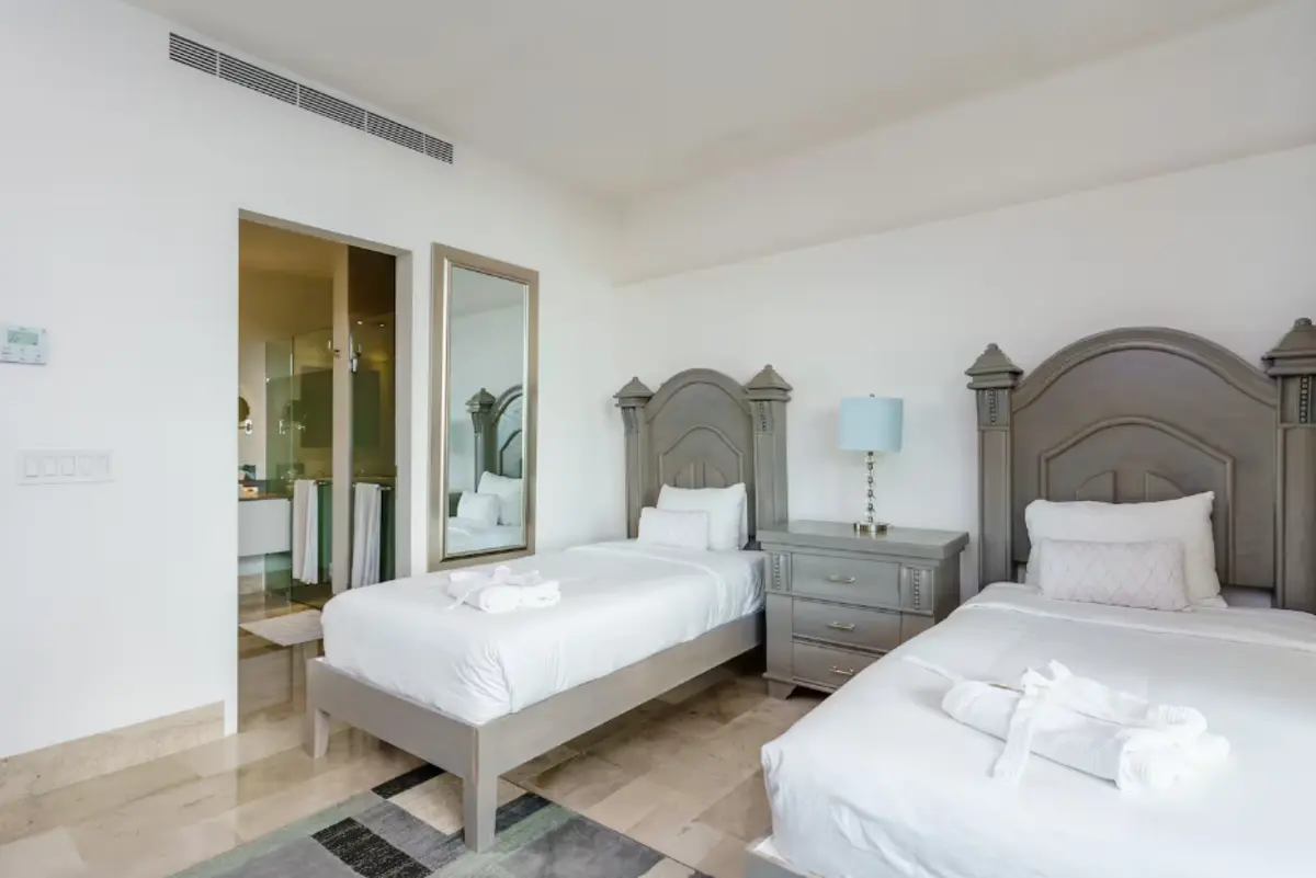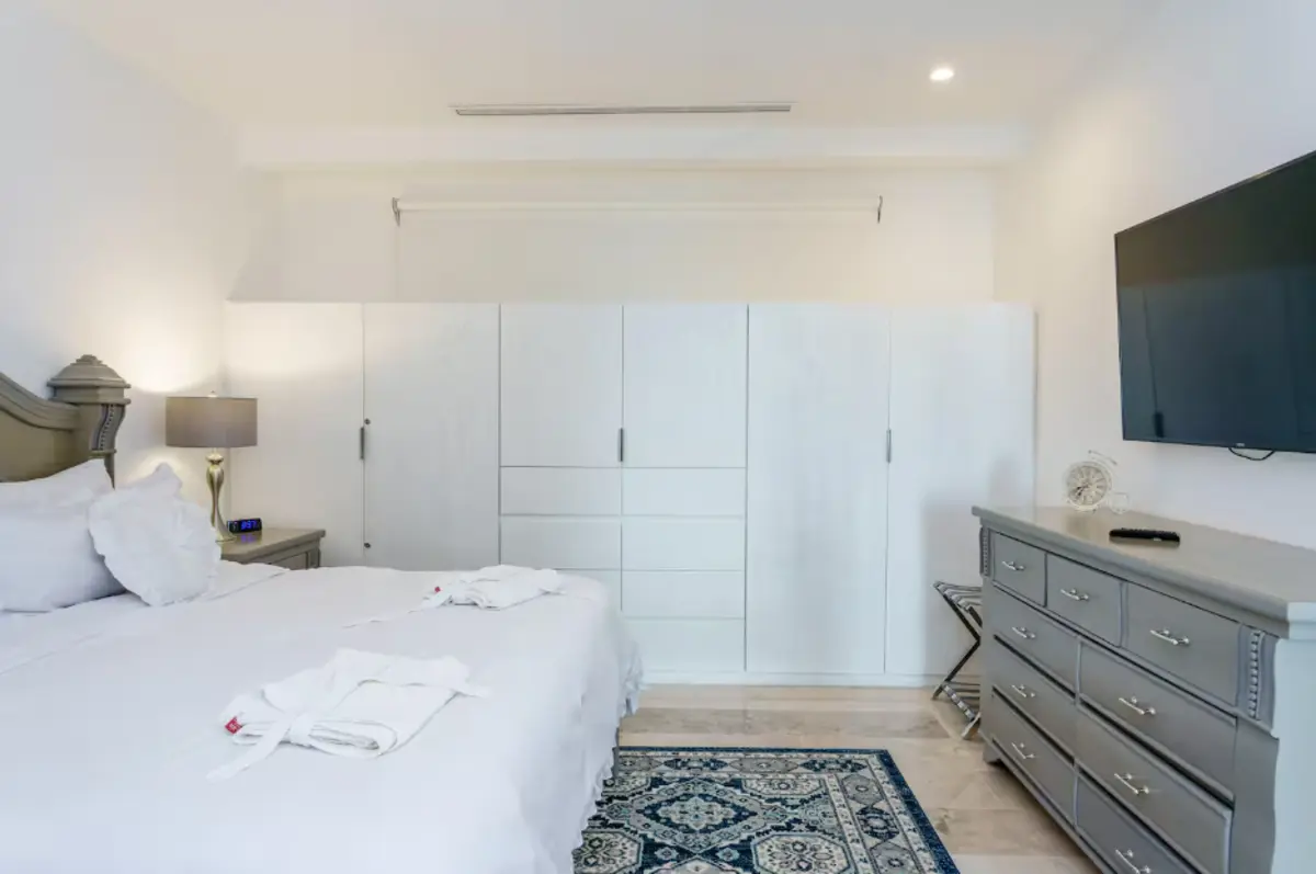 Main bedrooms: four bright bedrooms equipped with central air conditioning, television, and en-suite bathrooms. The master suite features a king-size bed; the second bedroom offers a queen-size bed, and the other two bedrooms each have two single beds, ideal for families or groups.