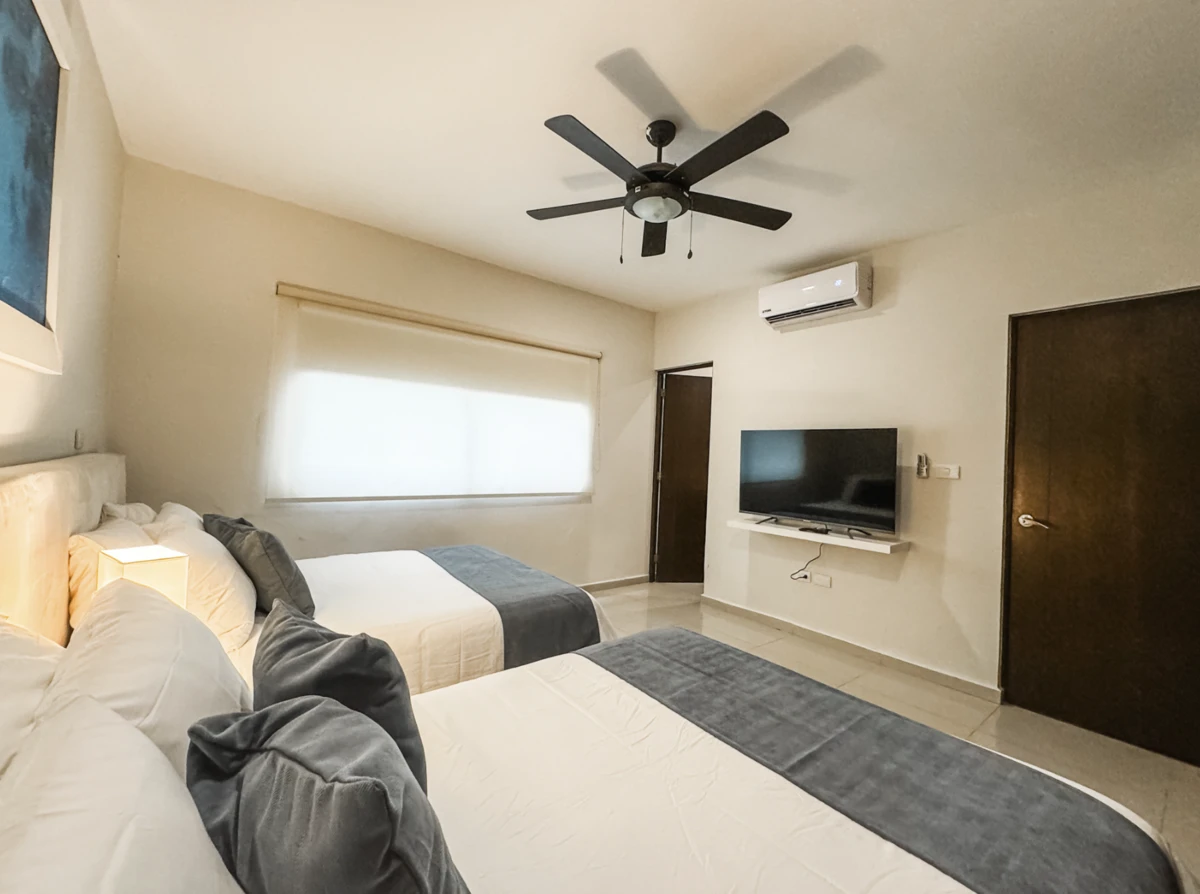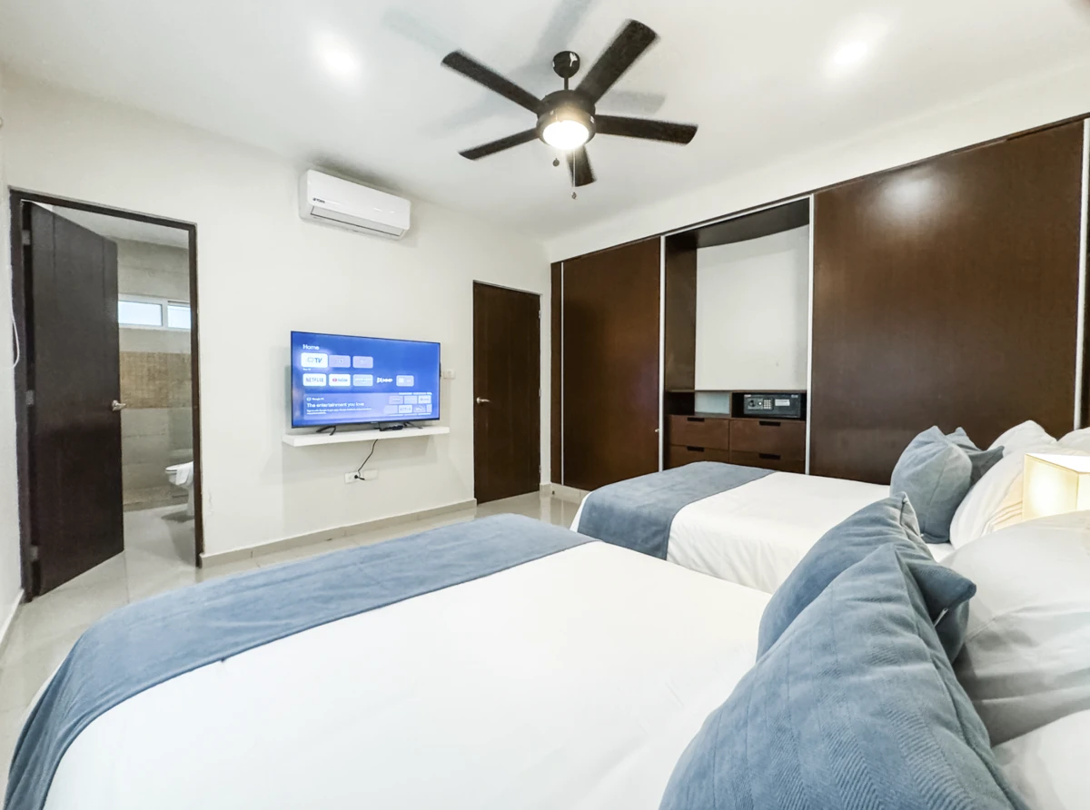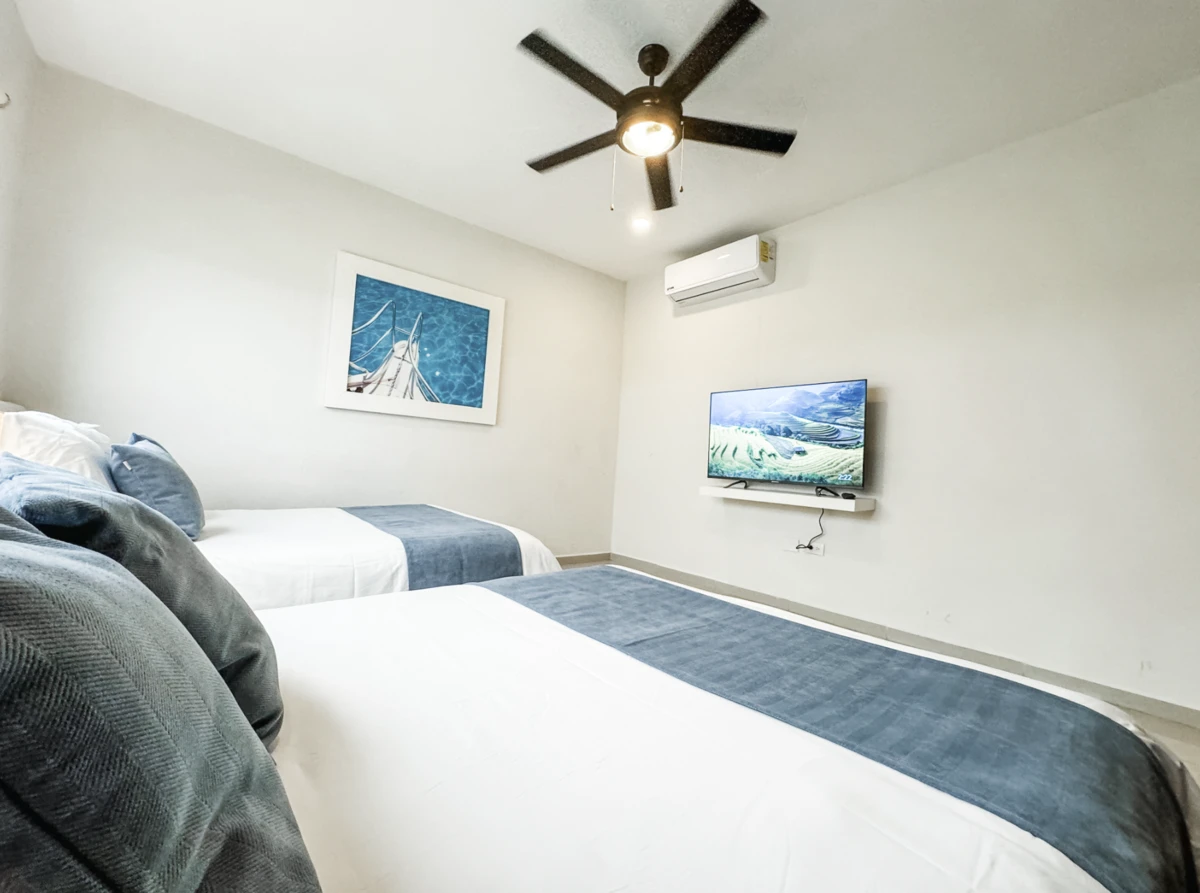 All bedrooms feature air conditioning (minisplits), ceiling fans, premium linens, LED TVs, and en-suite bathrooms: