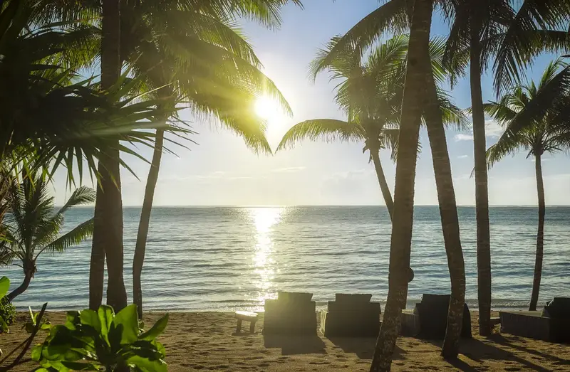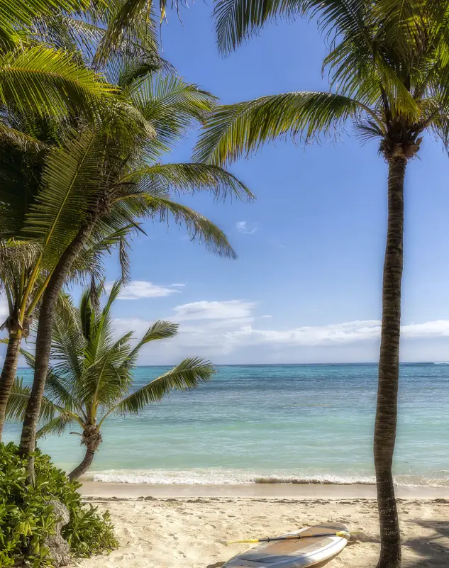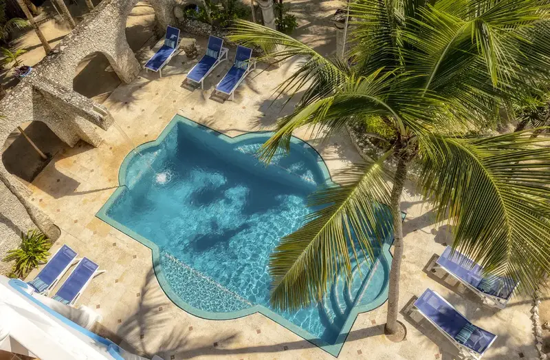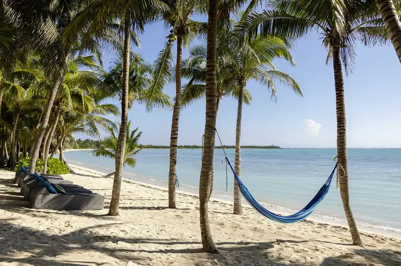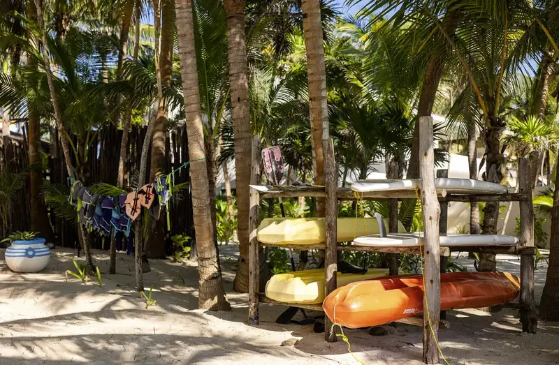 Outside, you’ll find your own slice of paradise. A stone path leads to the pool, which is surrounded by hammocks and sunbeds under palm trees. Just steps away is your private beach, where you can lounge or explore the calm waters with the villa’s kayaks.