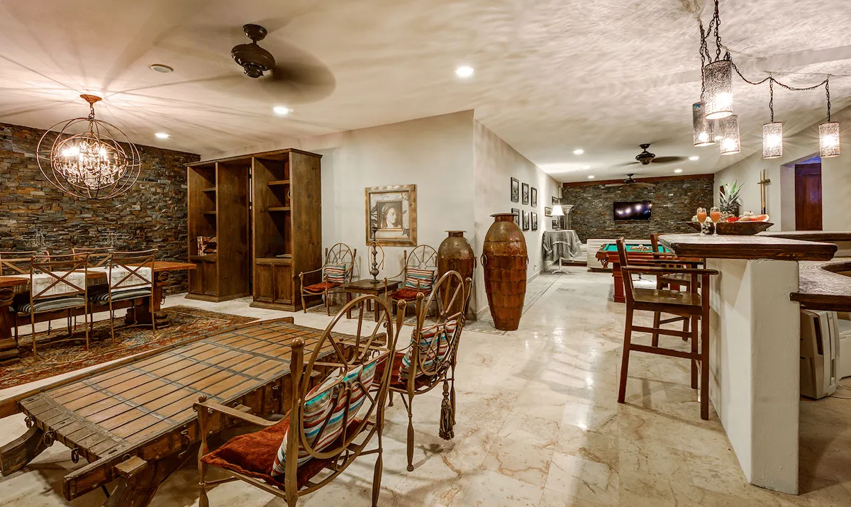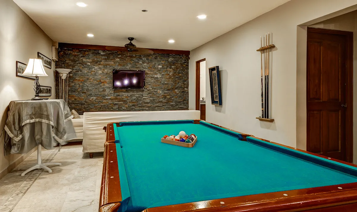 The villa wraps around a central pool deck with ocean views, featuring spacious indoor and outdoor living areas perfect for families, groups of friends, or special celebrations. The open-concept kitchen, dining, and living room flow seamlessly to the pool and beach, while the basement entertainment space with pool table, full bar, private bathroom, and media room/bedroom makes it ideal for movie nights, games, or extra sleeping space for kids or nannies.