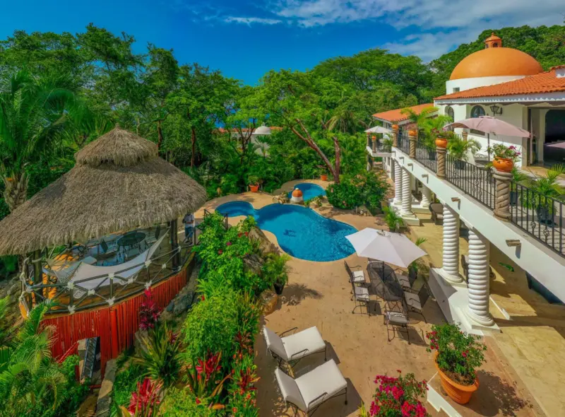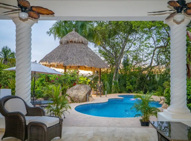 - Two spectacular heated pools (upper infinity + lower lagoon-style) surrounded by jungle