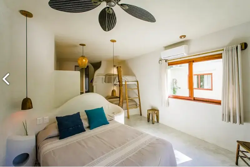 - Bedroom 3 (Middle Floor) – Queen-size bed + built-in bunk beds, ensuite bathroom, Juliette balcony, jungle vibe