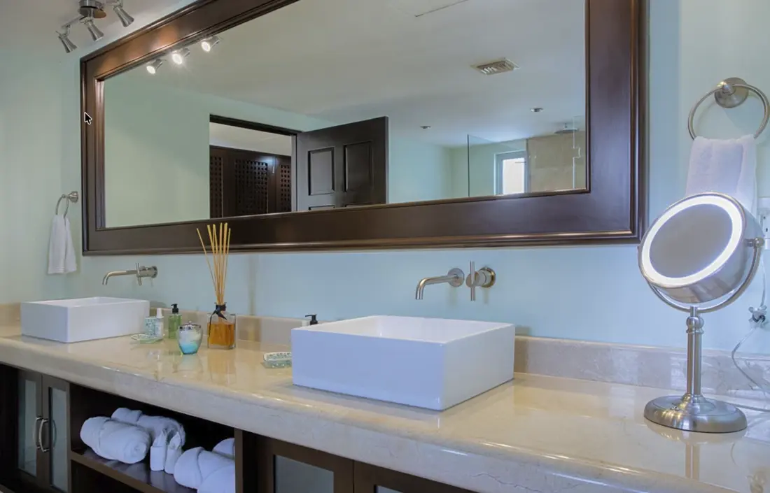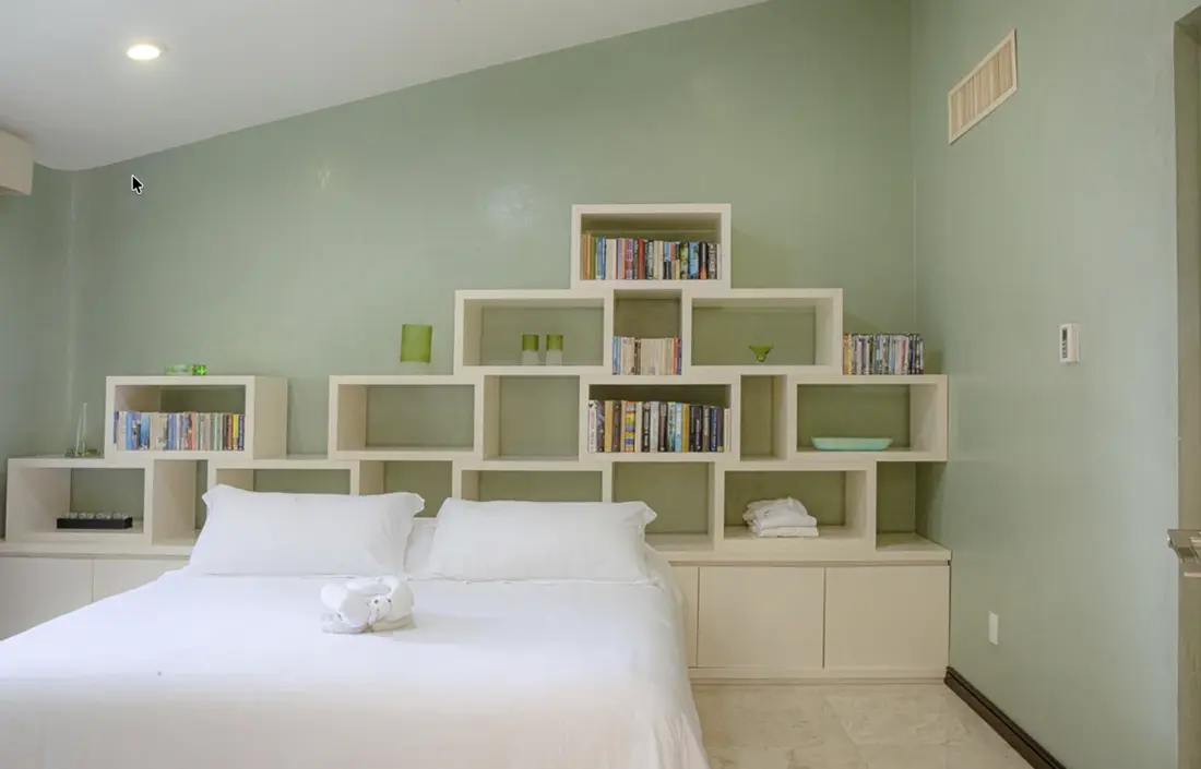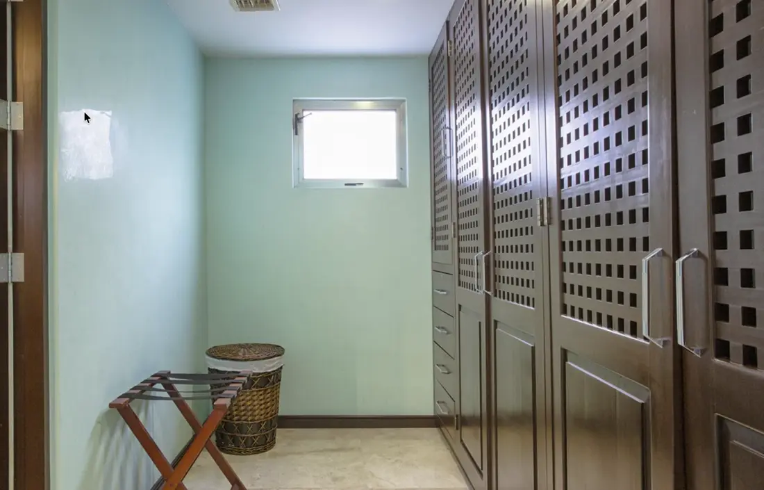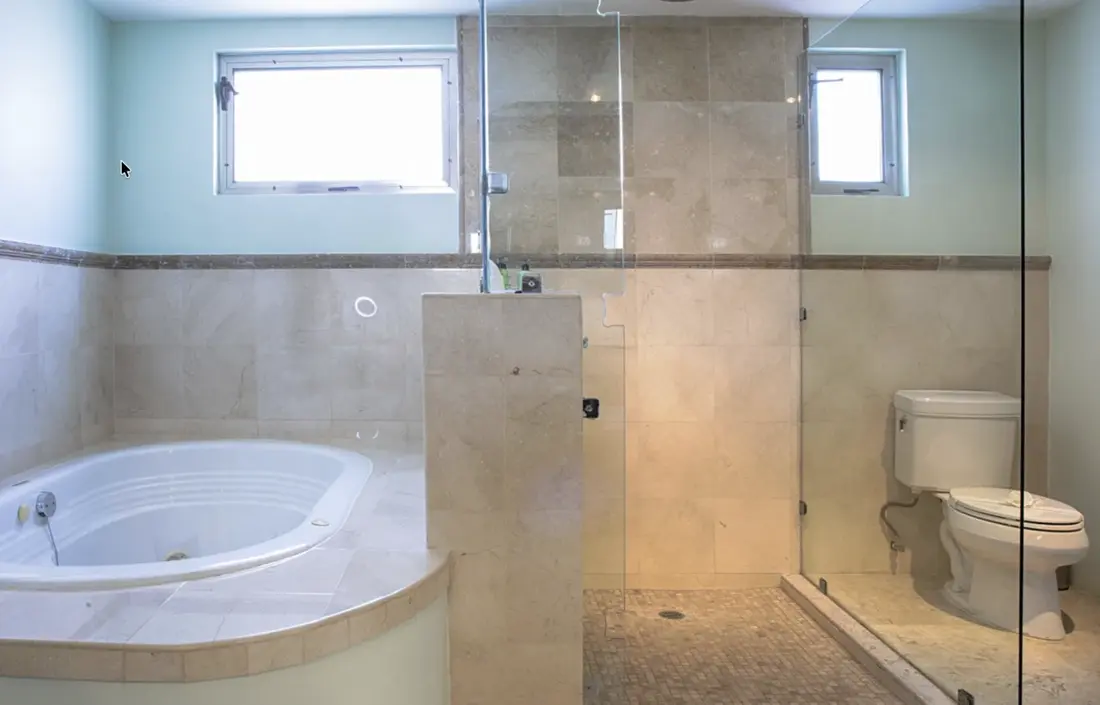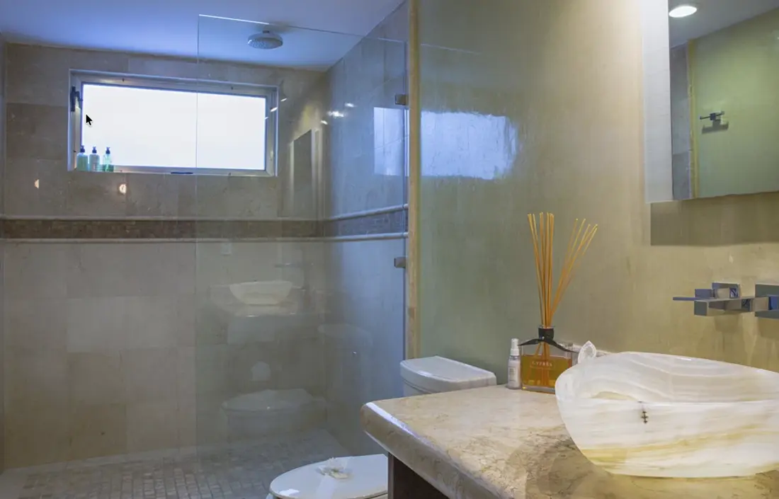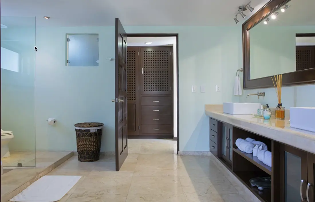 - Master Bedroom (Upper Floor) – King-size bed, ensuite bathroom with shower & Jacuzzi bathtub, walk-in mahogany closet, lounge area, flat-screen TV, private palapa-covered terrace with infinity pool, ocean views