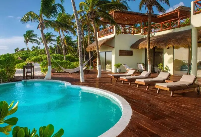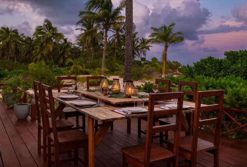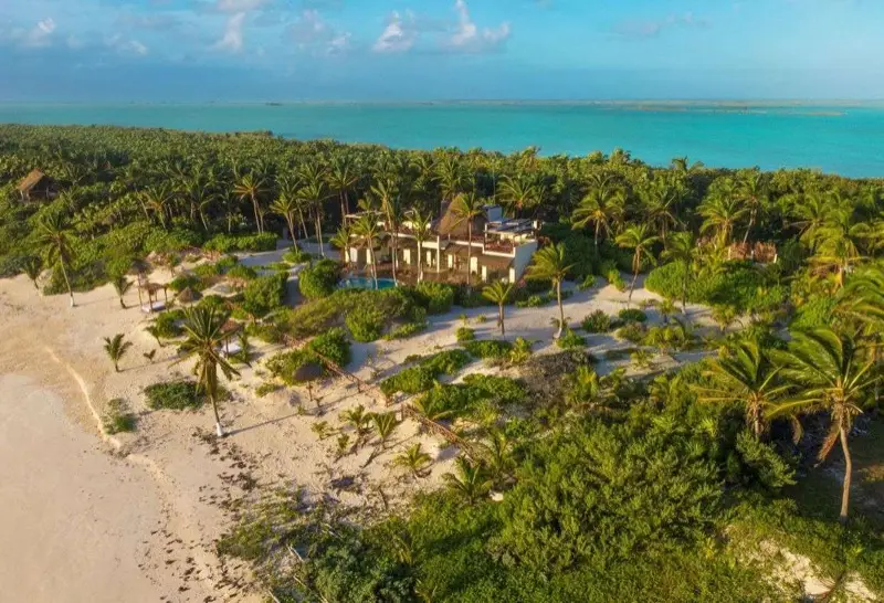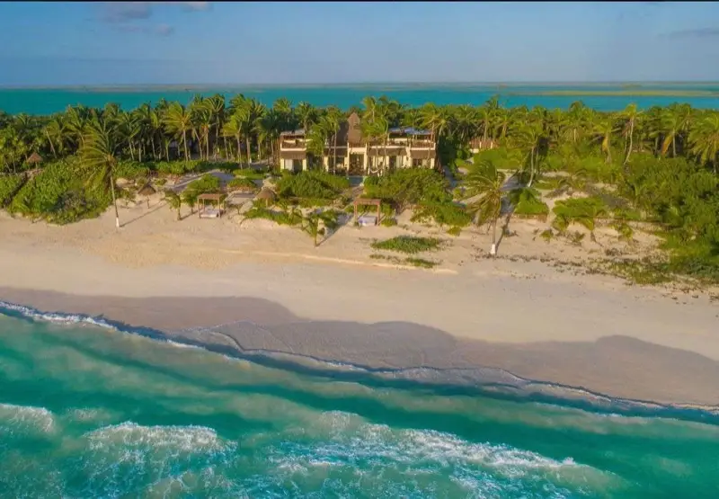The private luxurious estate sits in the unspoiled environment of Sian Ka’an Biosphere, a Unesco world heritage protected reserve. Its location is ideal for seclusion, sitting on a pristine Caribbean beach surrounded by coconut palms and lush vegetation. In front of you is the Caribbean Sea with a stunning coral reef 100m out. Behind you is a calm and serene natural lagoon – all of this is within a private estate.