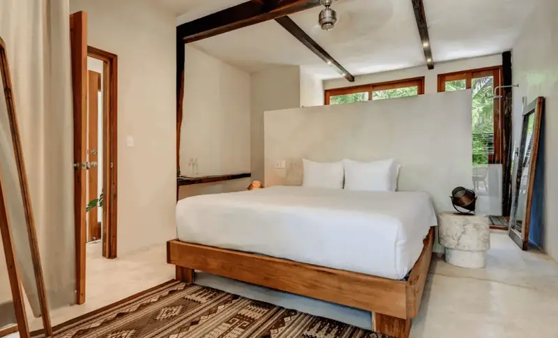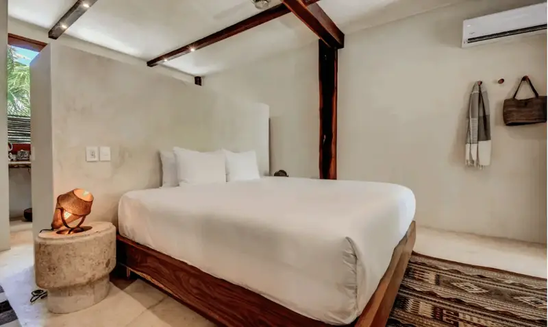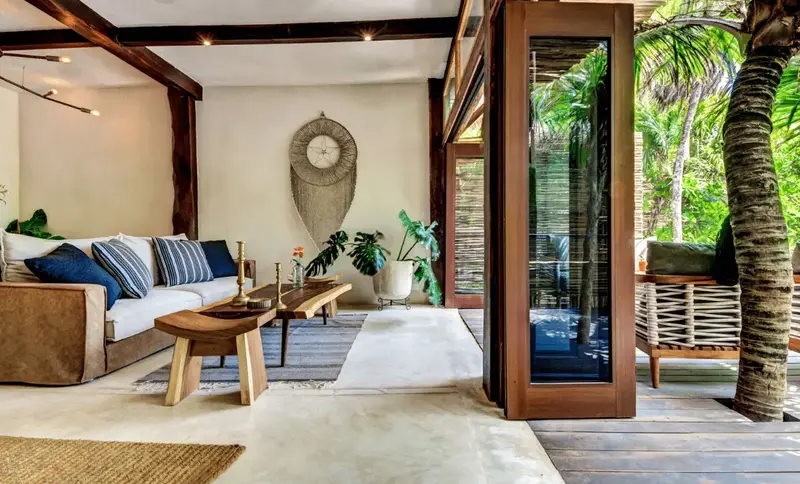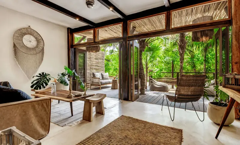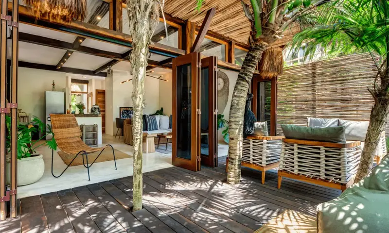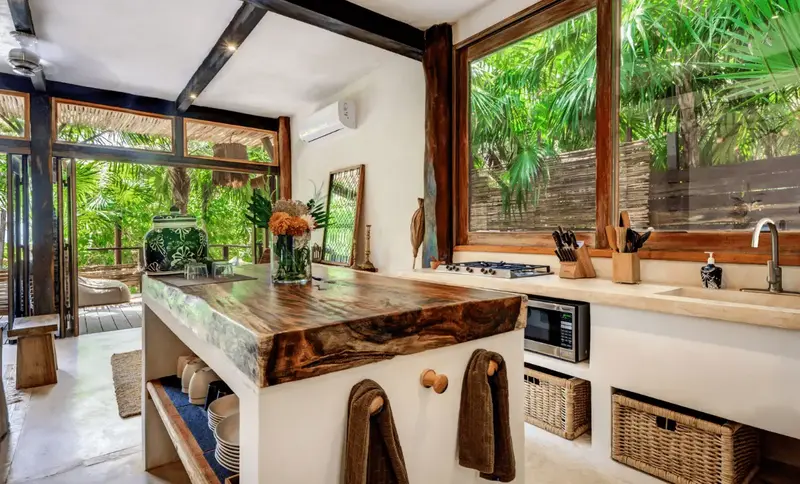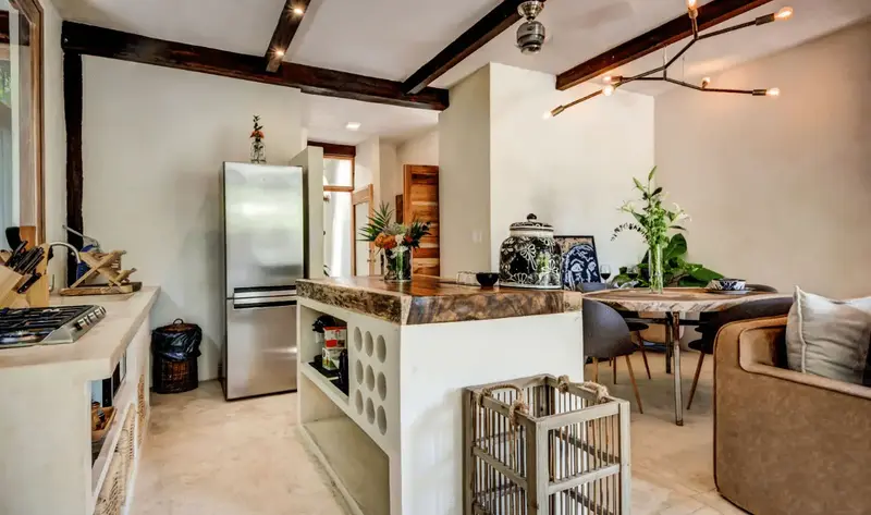 Aldea villa in Tulum Beach features two separate bedrooms with en-suite bathrooms, a living and dining room area with a fully equipped kitchen corner and a private terrace with beautiful garden views.