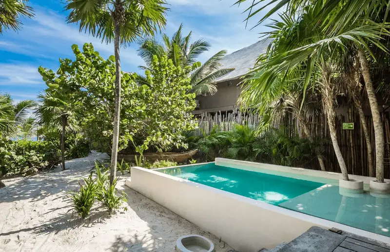 Combining spaces and outdoor lush vegetation, Aldea Villa offers open garden views and direct access to Tulum Beach. Through beautiful access between jungle in Tulum.