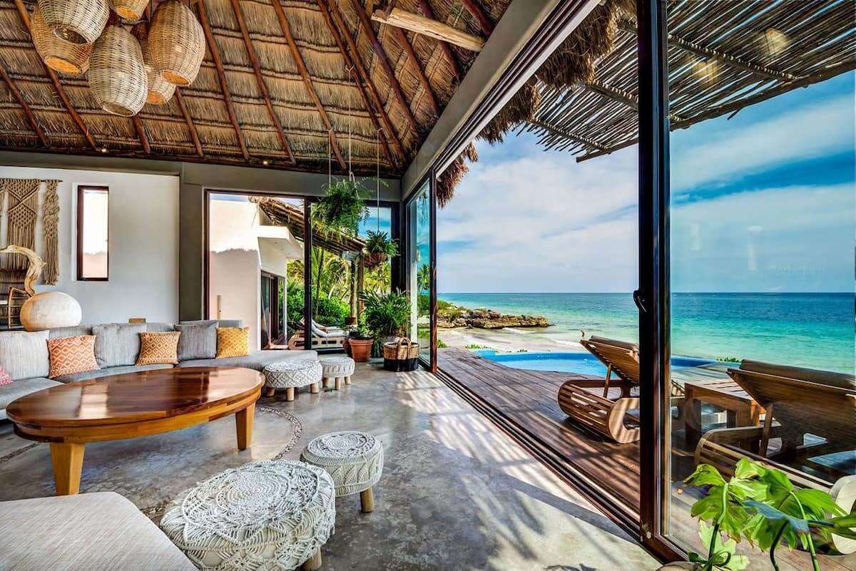 An incredibly beautifully constructed villa featuring a grand palapa front room with wall-to-wall panoramic views of the beach and sea. The Villa is irrefutably a vision from the heavens. This extraordinary oceanfront home is situated along the coastal beach road, just one-and-a-half miles south of the cliffside ancient Mayan ruins of Tulum and within walking distance of some of Tulum’s top restaurants.