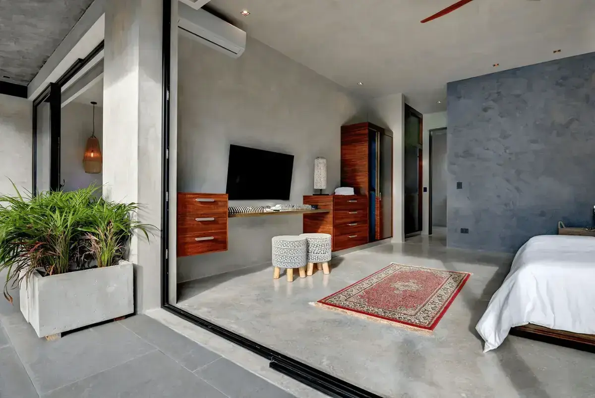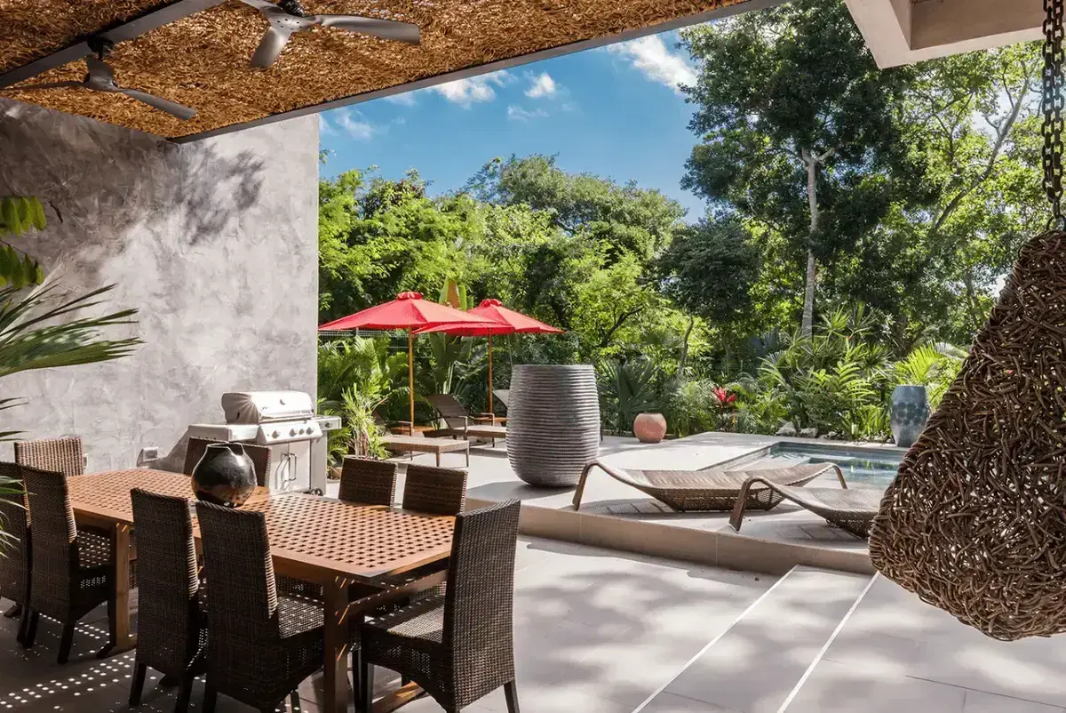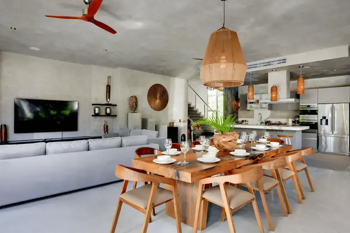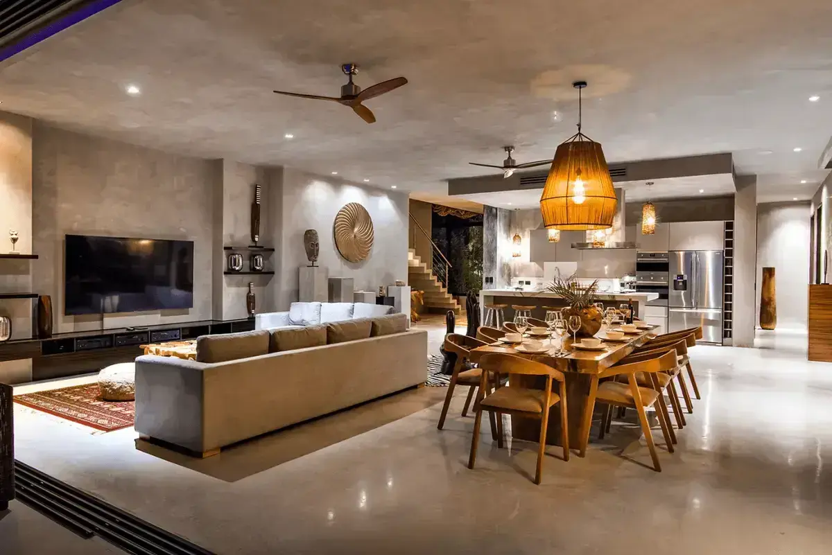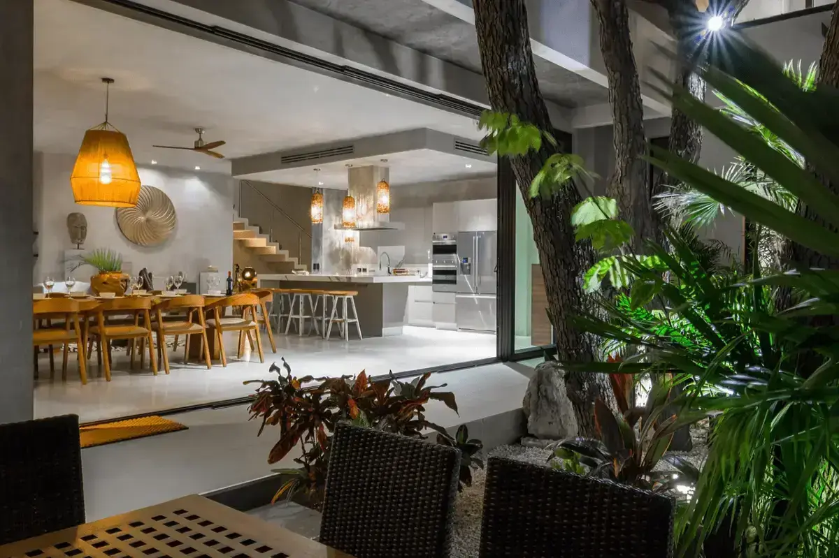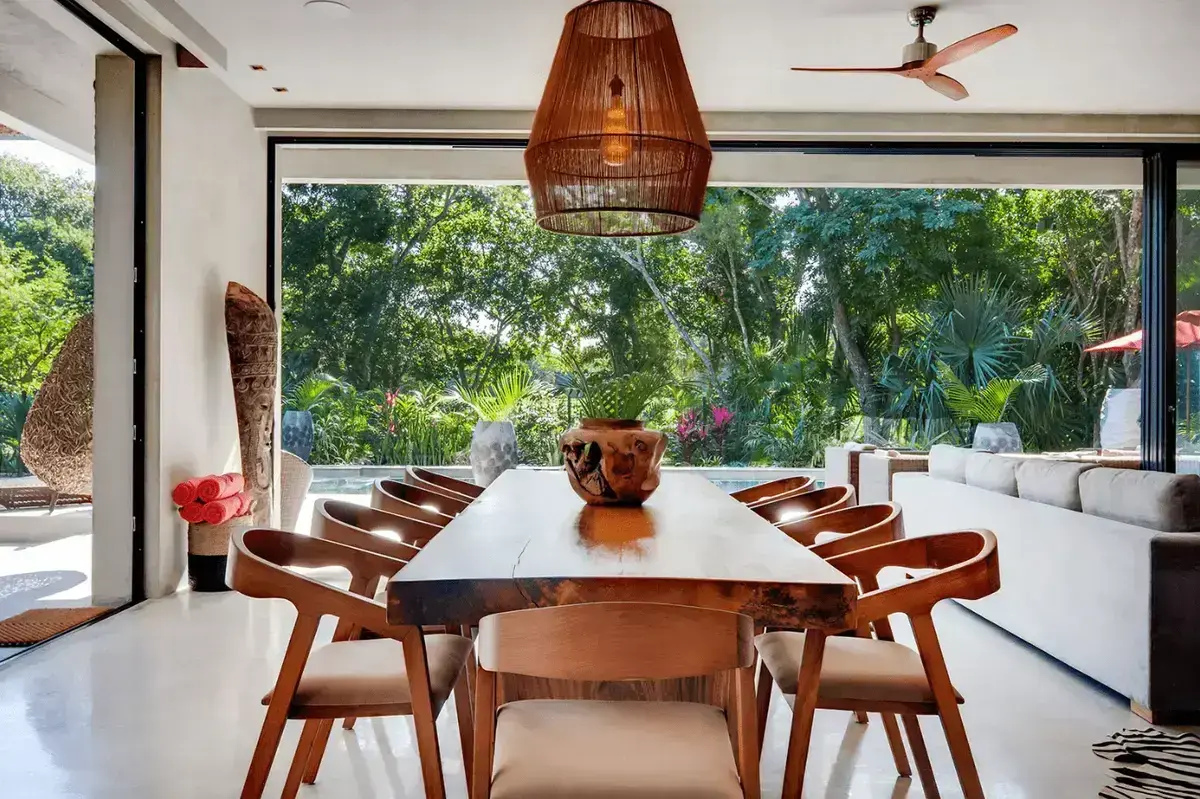 Tucked inside the tranquil, gated community of Playacar Phase II, Villa Nah pairs effortless sophistication with warm, rustic accents — polished cement walls, Dali-esque artistic touches, and designer furnishings create an elegant, airy home made for gathering. Minutes from Playa del Carmen’s best beach and the vibrant energy of 5th Avenue, yet peacefully bordered by the 18-hole Playacar golf course, this modern retreat offers serene jungle-green views and the perfect balance of privacy and accessibility.