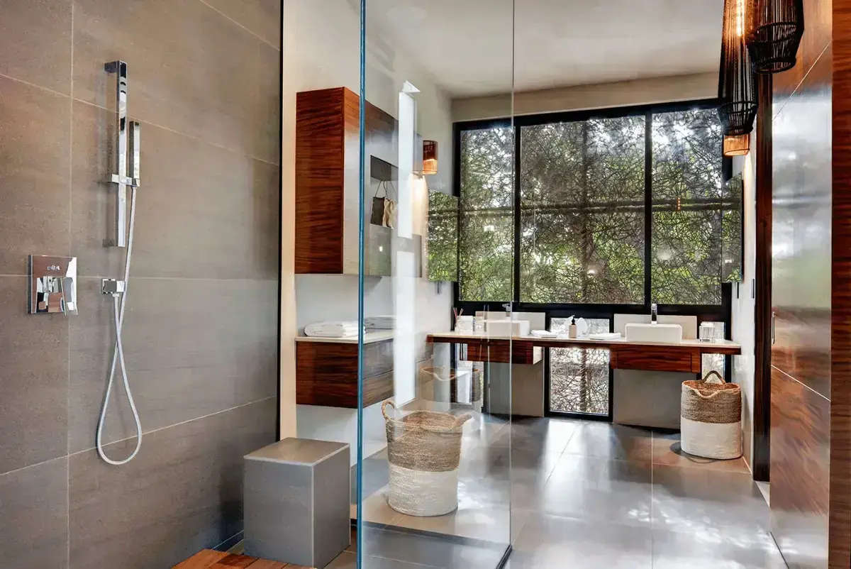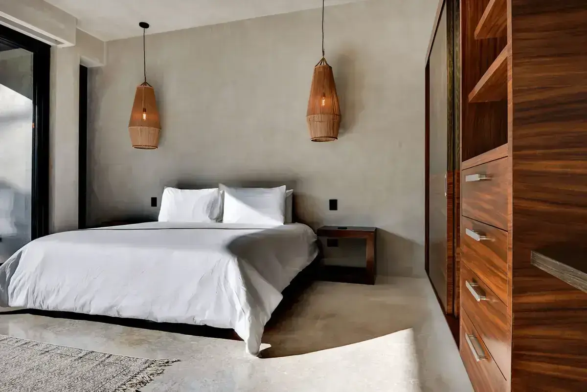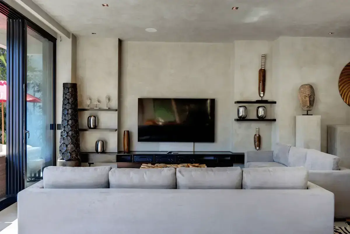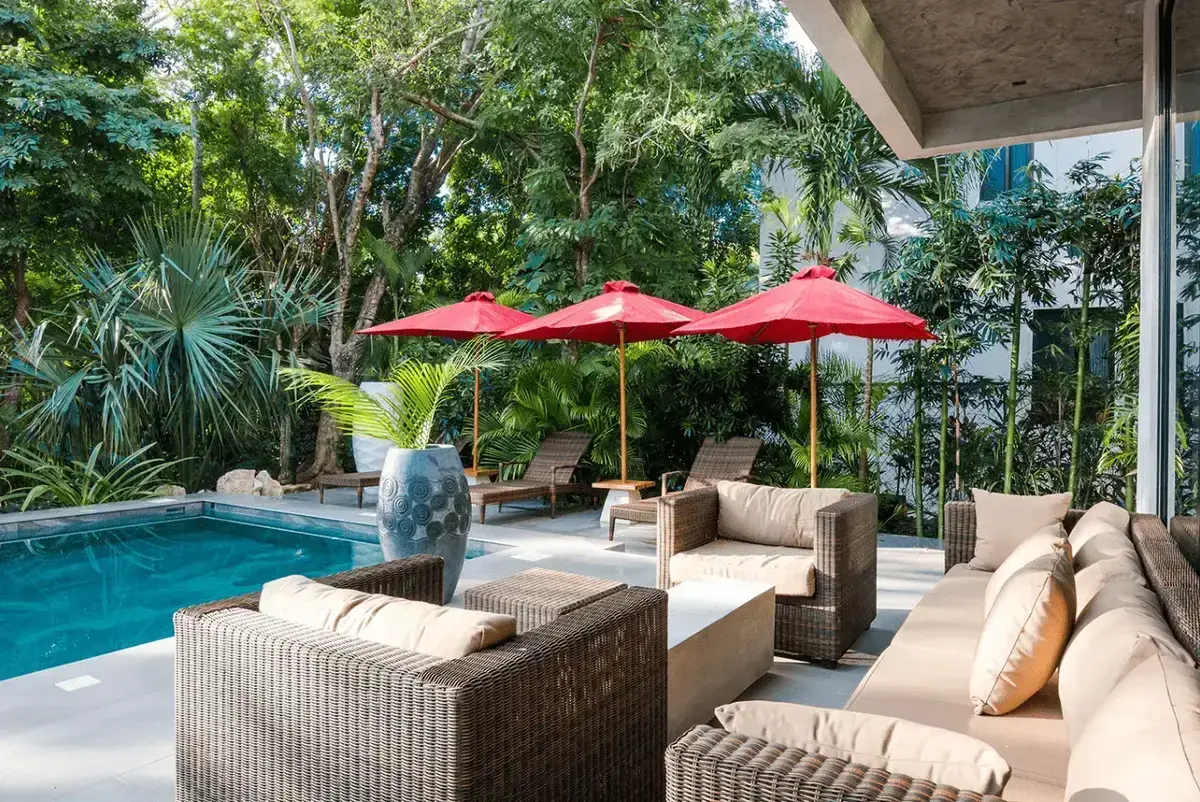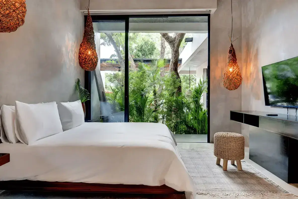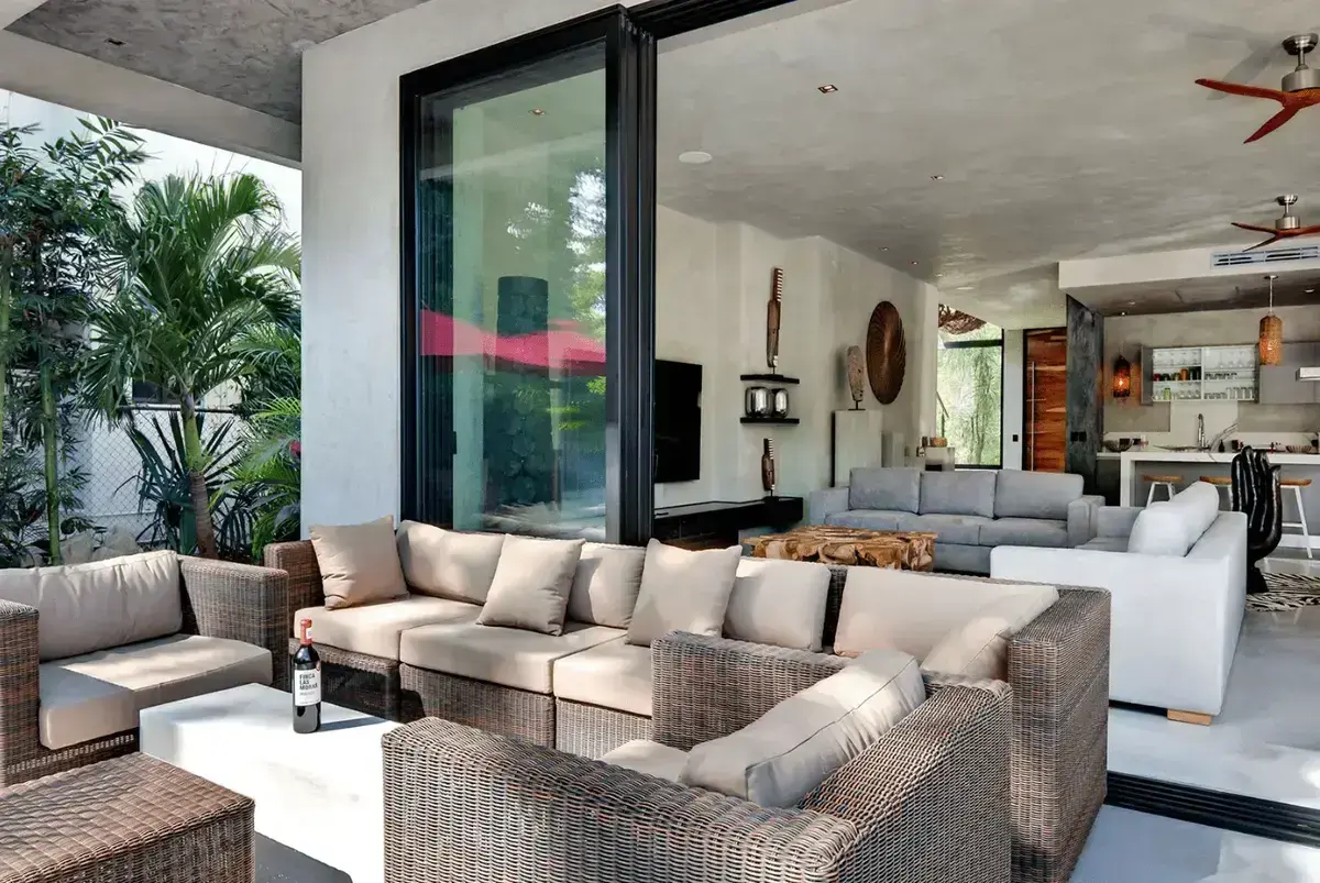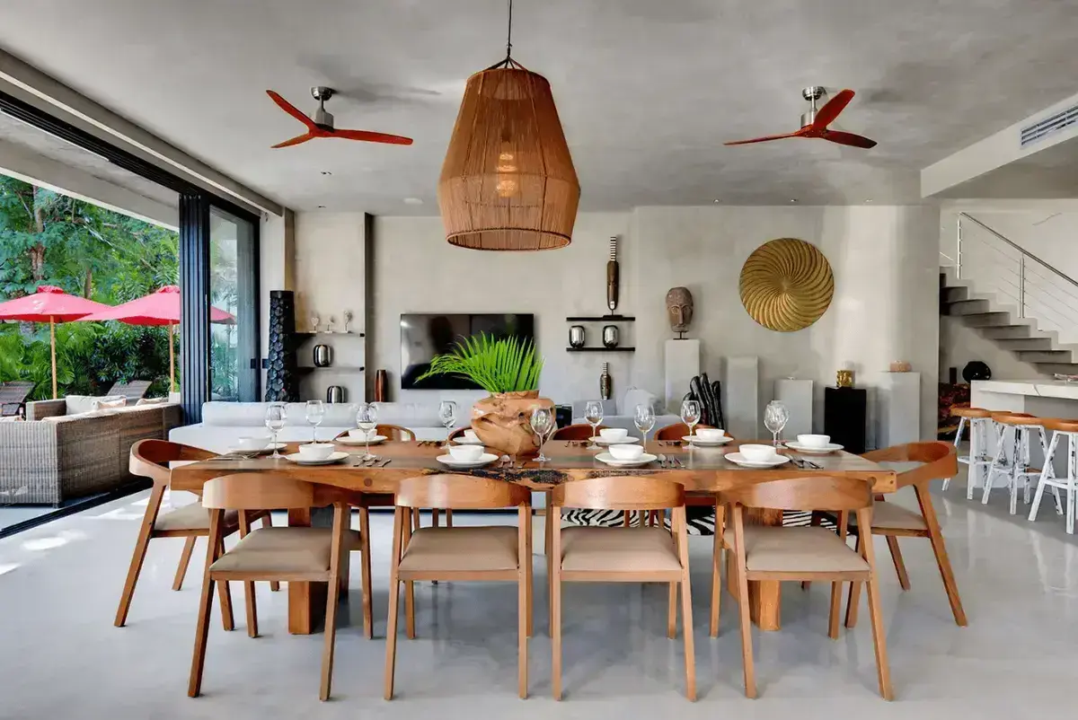 Tucked inside the tranquil, gated community of Playacar Phase II, Villa Nah pairs effortless sophistication with warm, rustic accents — polished cement walls, Dali-esque artistic touches, and designer furnishings create an elegant, airy home made for gathering. Minutes from Playa del Carmen’s best beach and the vibrant energy of 5th Avenue, yet peacefully bordered by the 18-hole Playacar golf course, this modern retreat offers serene jungle-green views and the perfect balance of privacy and accessibility.