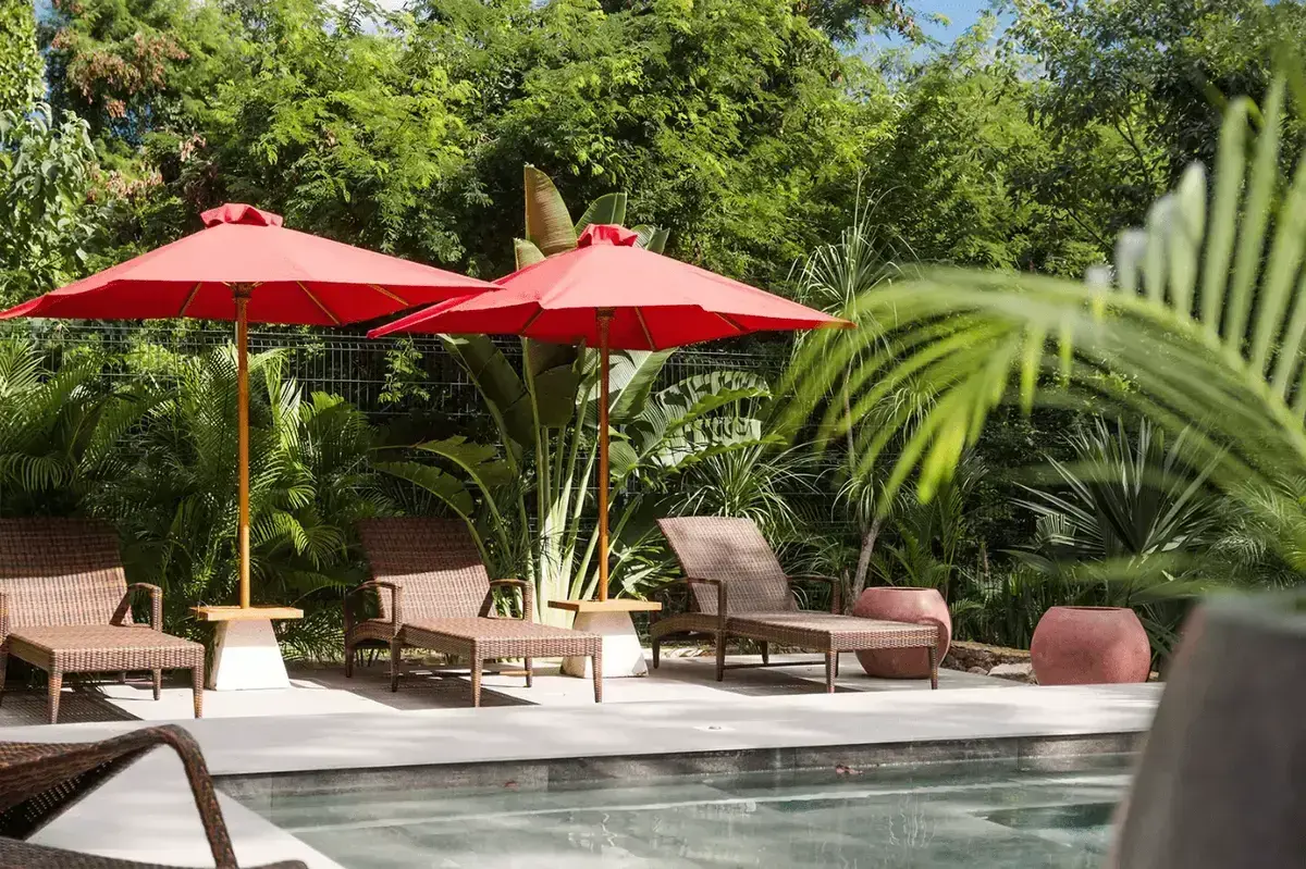 Two upstairs suites share a balcony overlooking the garden; one downstairs suite opens directly to the pool deck.