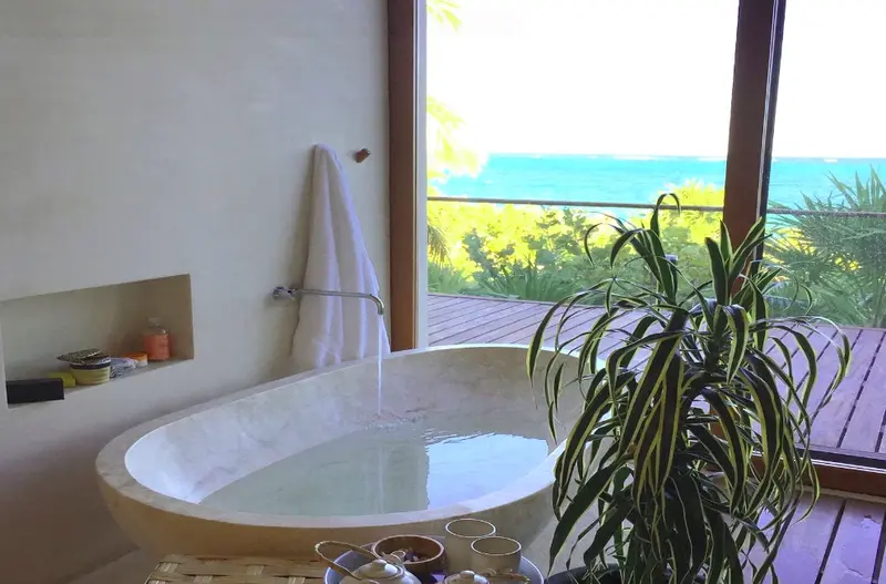 Inside the villa, the modern comforts continue. From a home theater to the glass-bottomed pool, every detail is designed for your enjoyment. Each of the four master suites offers unparalleled luxury, featuring king-size beds, handmade stone tubs, private terraces with sea views, and spacious leafy showers.