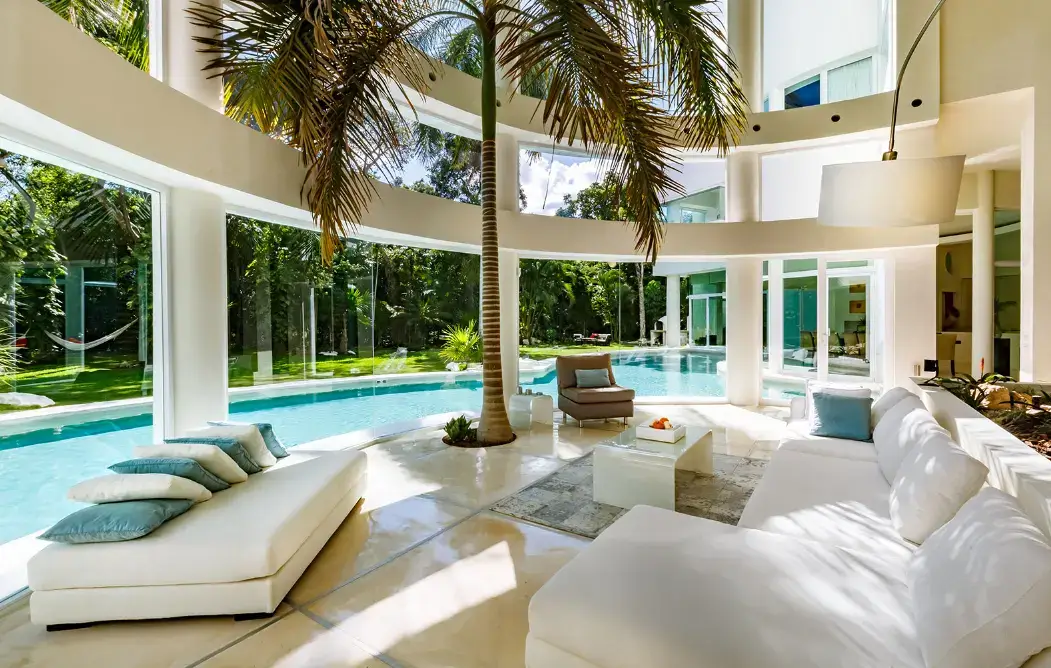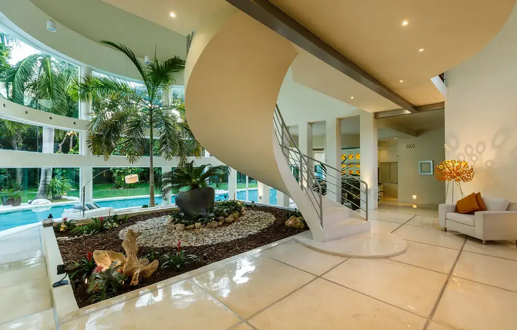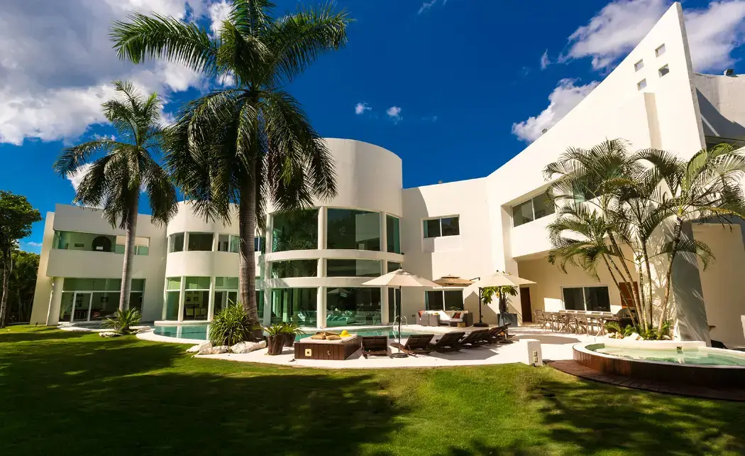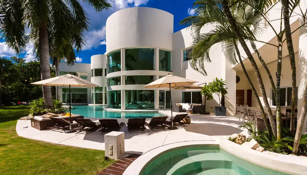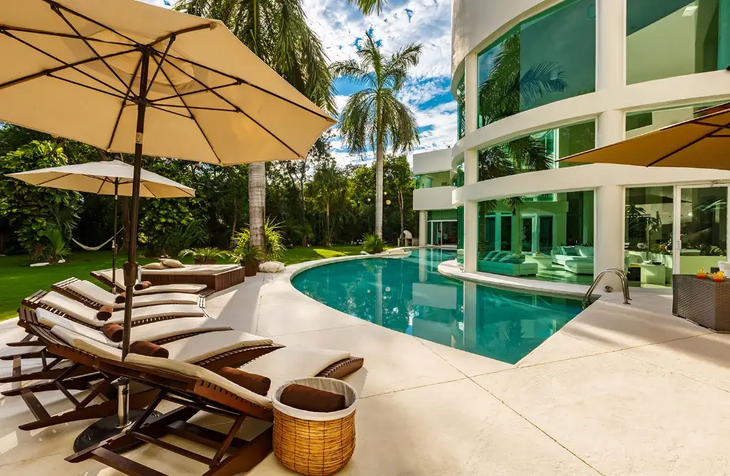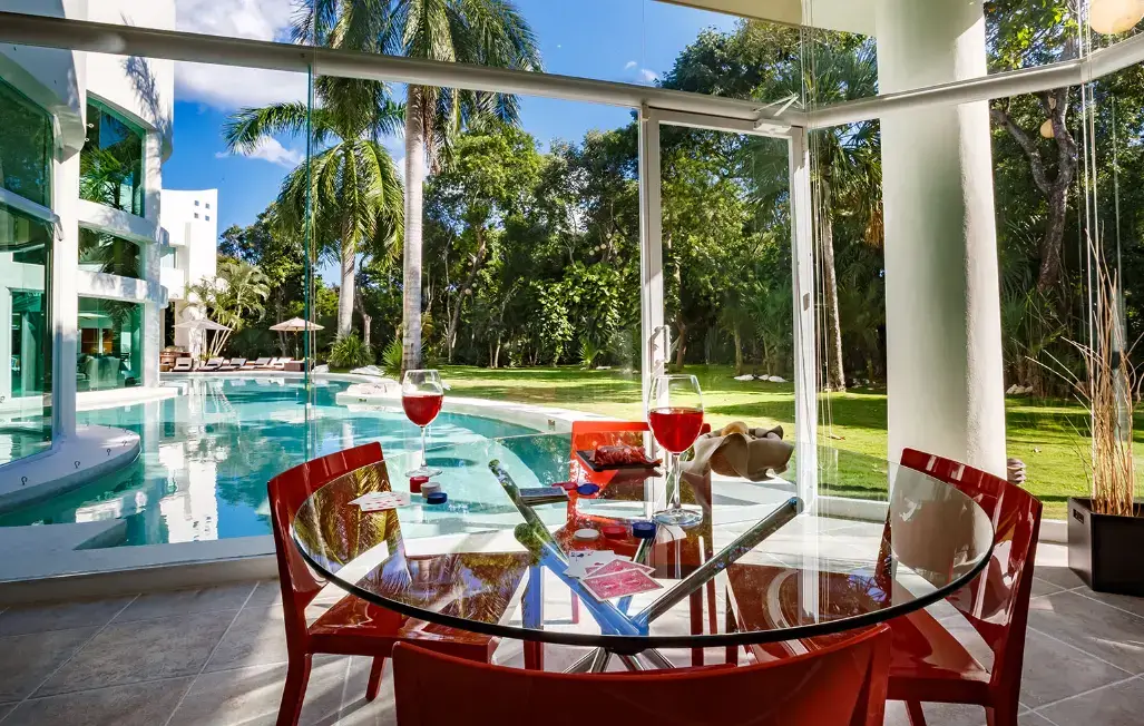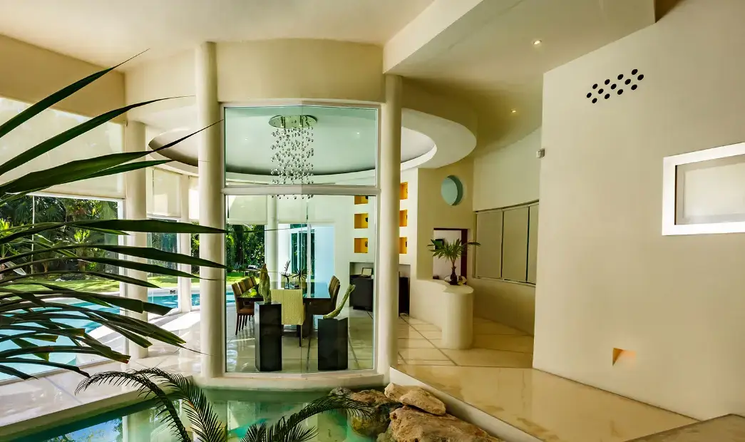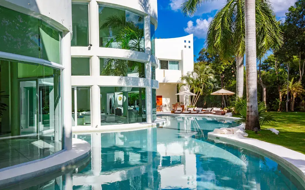 Set within Playacar, Playa del Carmen’s most exclusive gated community, this 5-bedroom contemporary villa features bold design, open spaces, and lush tropical surroundings. The centerpiece is a moat-style swimming pool wrapping around the home’s striking central turret, where a towering palm tree rises through double-height ceilings.