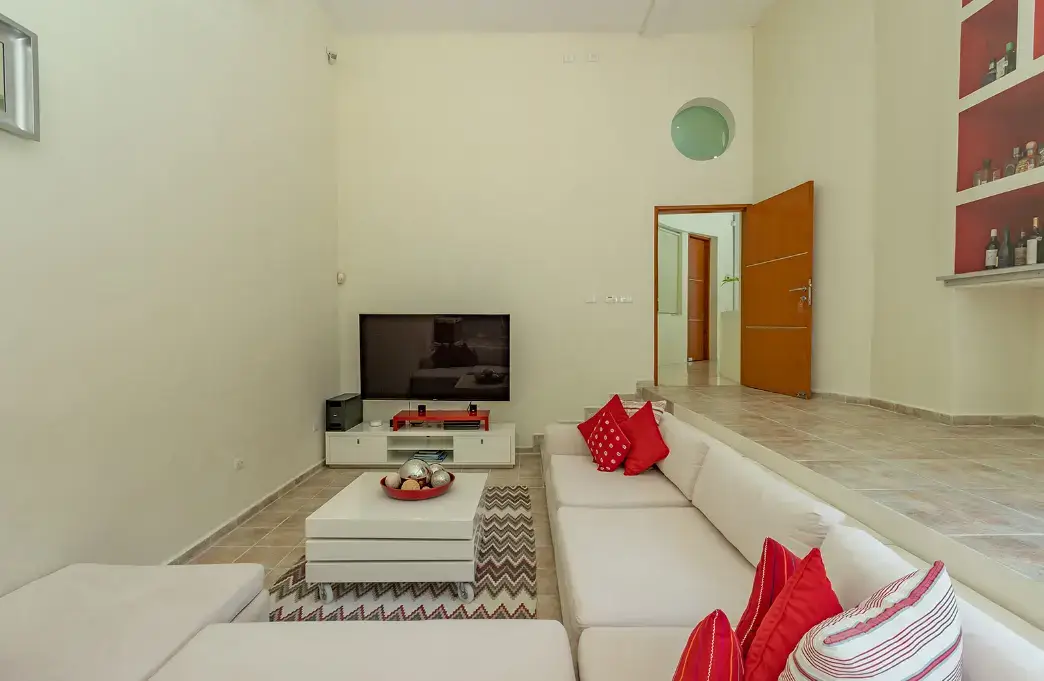 Inside, you’ll find a seamless mix of modern architecture and playful décor. The living room’s panoramic windows bring in natural light and views of the gardens, while the gourmet kitchen features professional-grade appliances and a spacious dining table for up to 10 guests.